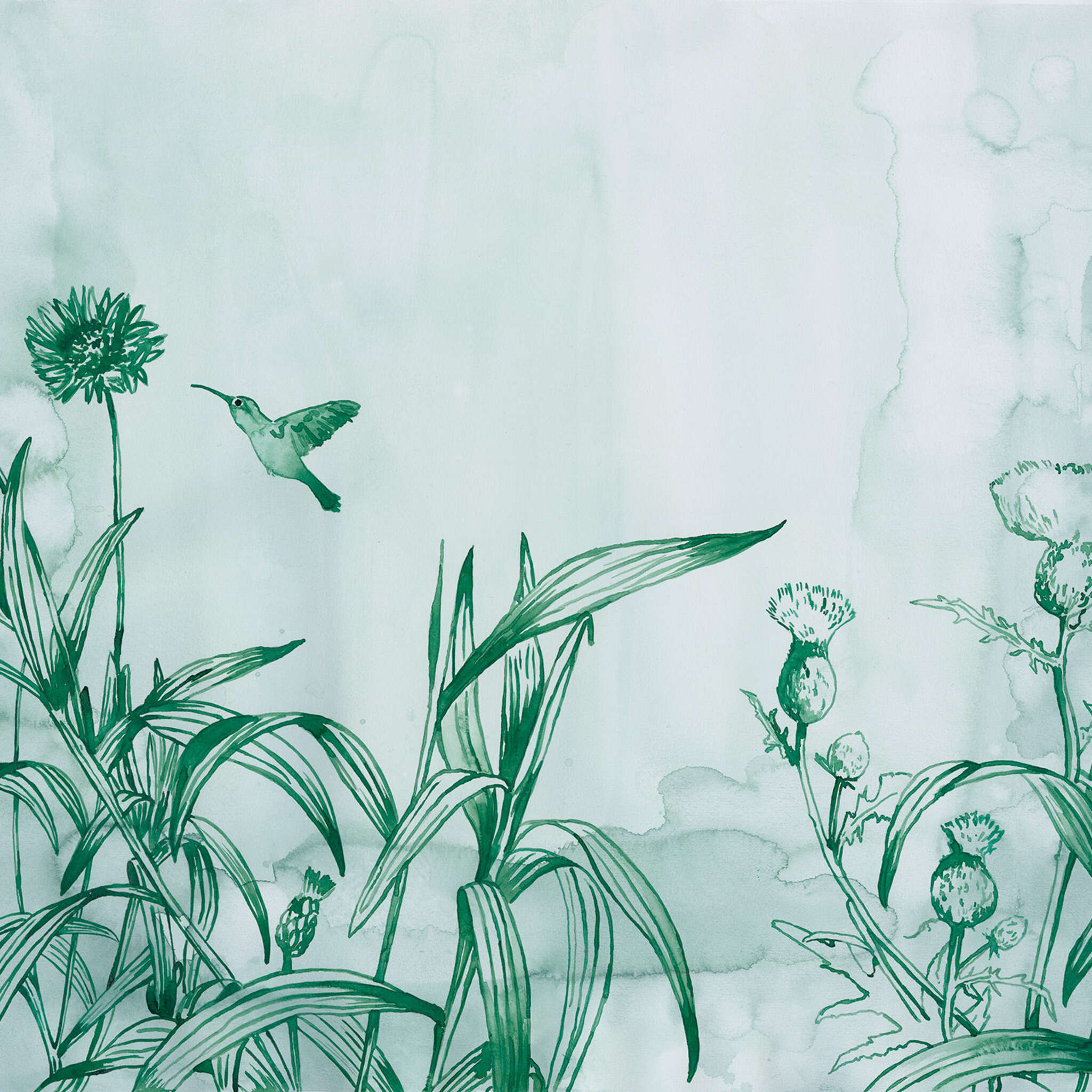 created by Leo la Douce: Ton in Ton und in Übergröße beeindruckt diese Blumenwiese mit kleinem Kolibri jeden Betrachter, denn auf 372 x 280 cm Fläche erstreckt sich dieses von Hand gezeichnete Digitaldruckmotiv in seiner vollen Größe. Dabei besticht es mit seiner gutgelaunten Handschrift und lädt dazu ein, schöne Stunden vor diesem Kunstwerk zu verbringen.