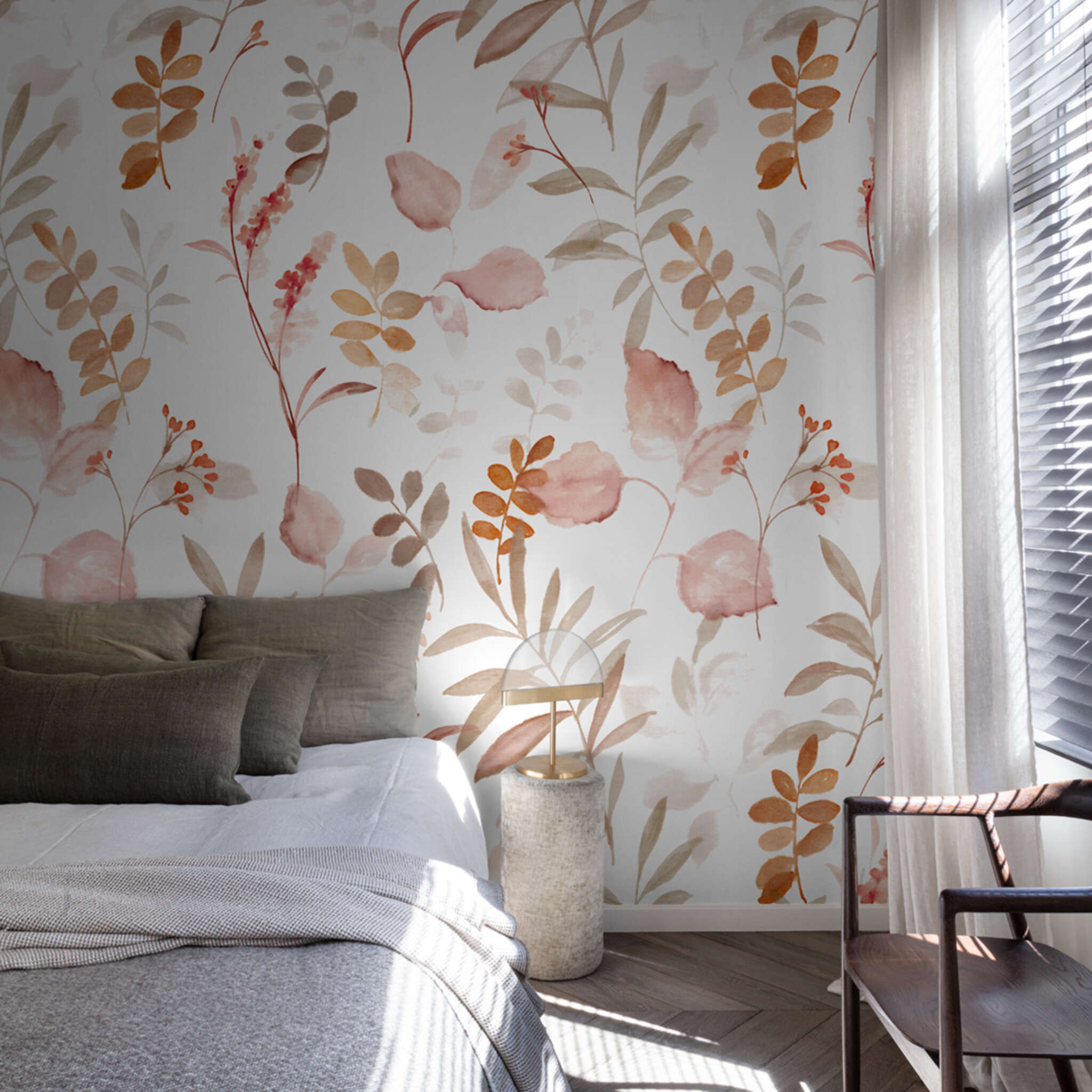 Diese Tapete Branches zeigt ein zartes florales Aquarellmuster in warmen, harmonischen Farbtönen. Verspielte Blätter und Blüten in Rosé, Terracotta und sanftem Beige verteilen sich leicht und luftig über den hellen Hintergrund. Der transparente Farbauftrag und die weichen Übergänge verleihen dem Design eine natürliche, handgemalte Anmutung. Ideal für Wohn- oder Schlafzimmer, die eine ruhige, elegante und zugleich lebendige Atmosphäre ausstrahlen sollen.