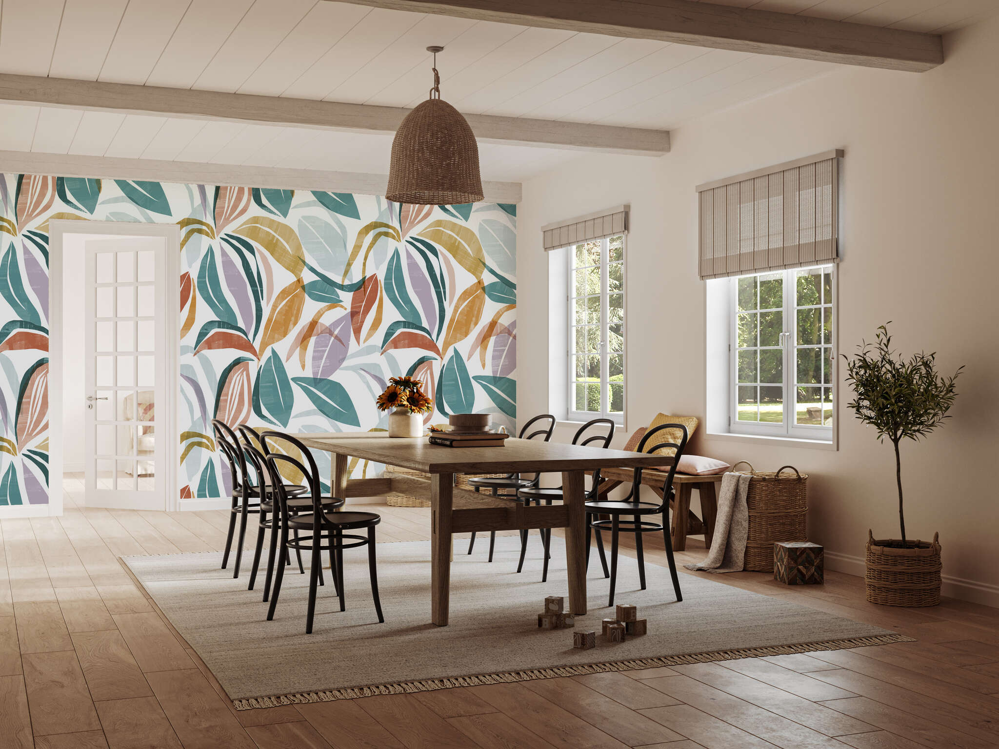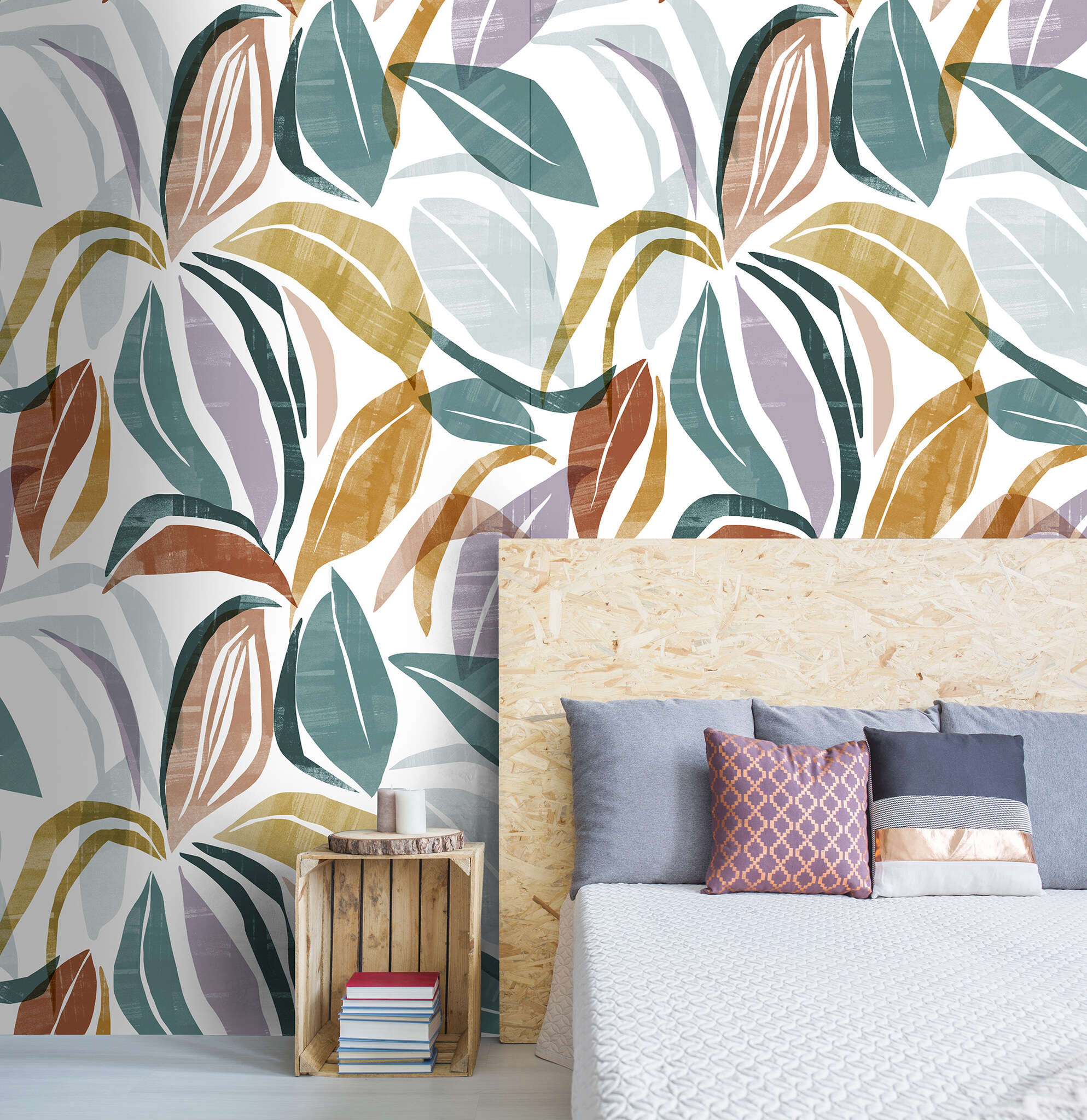 Die Fototapete Colored Leaves zeigt ein modernes, grafisches Blättermotiv in kräftigen, dennoch harmonischen Farben. Schwungvolle Formen in Petrol, Senfgelb, Rostorange und zartem Flieder überlagern sich auf einem weißen Hintergrund und erzeugen eine lebendige, künstlerische Komposition. Die leicht strukturierte Oberfläche erinnert an handgedruckte Texturen und verleiht dem Design Tiefe und Dynamik. Ideal für Akzentwände, die Frische, Stil und kreative Energie ausstrahlen sollen.