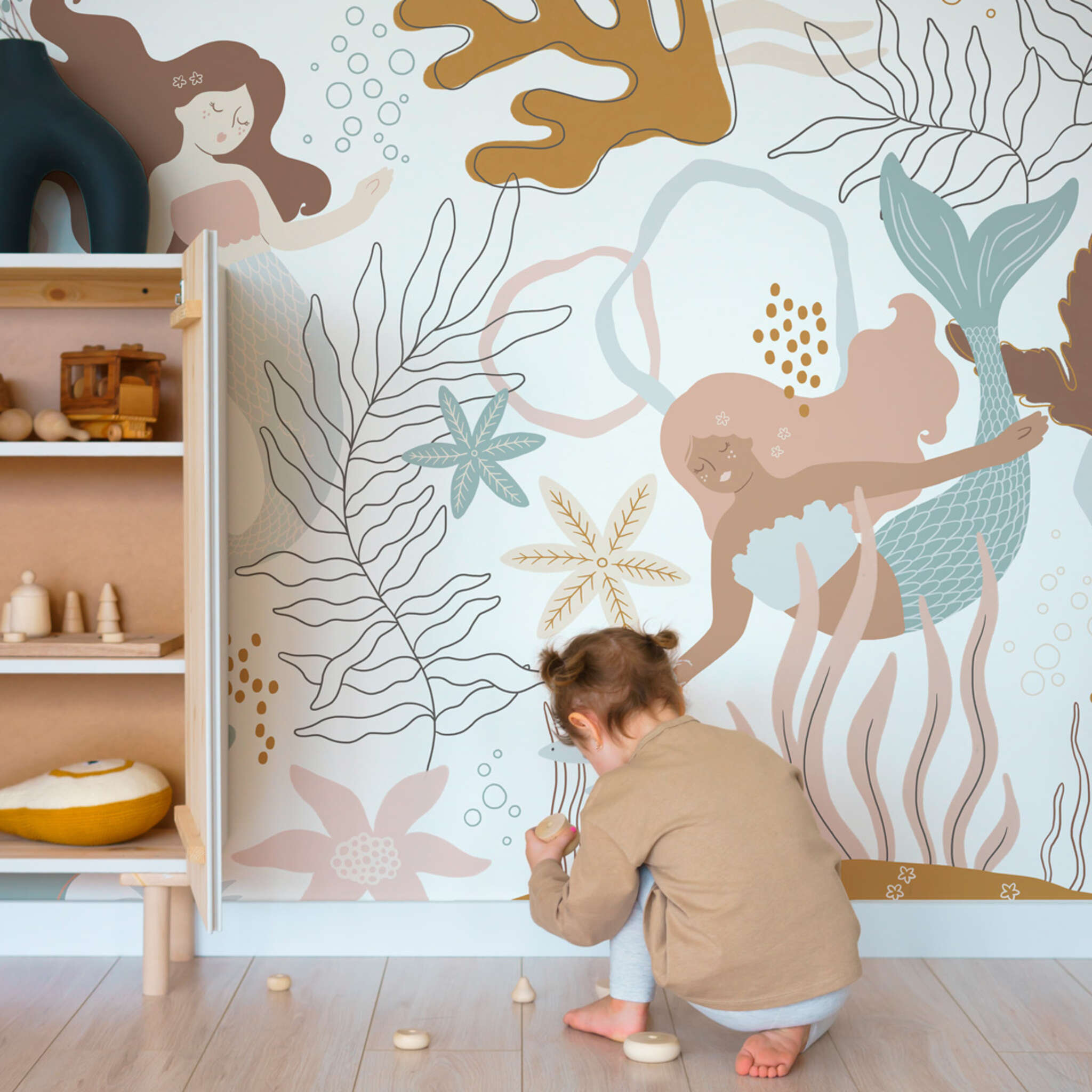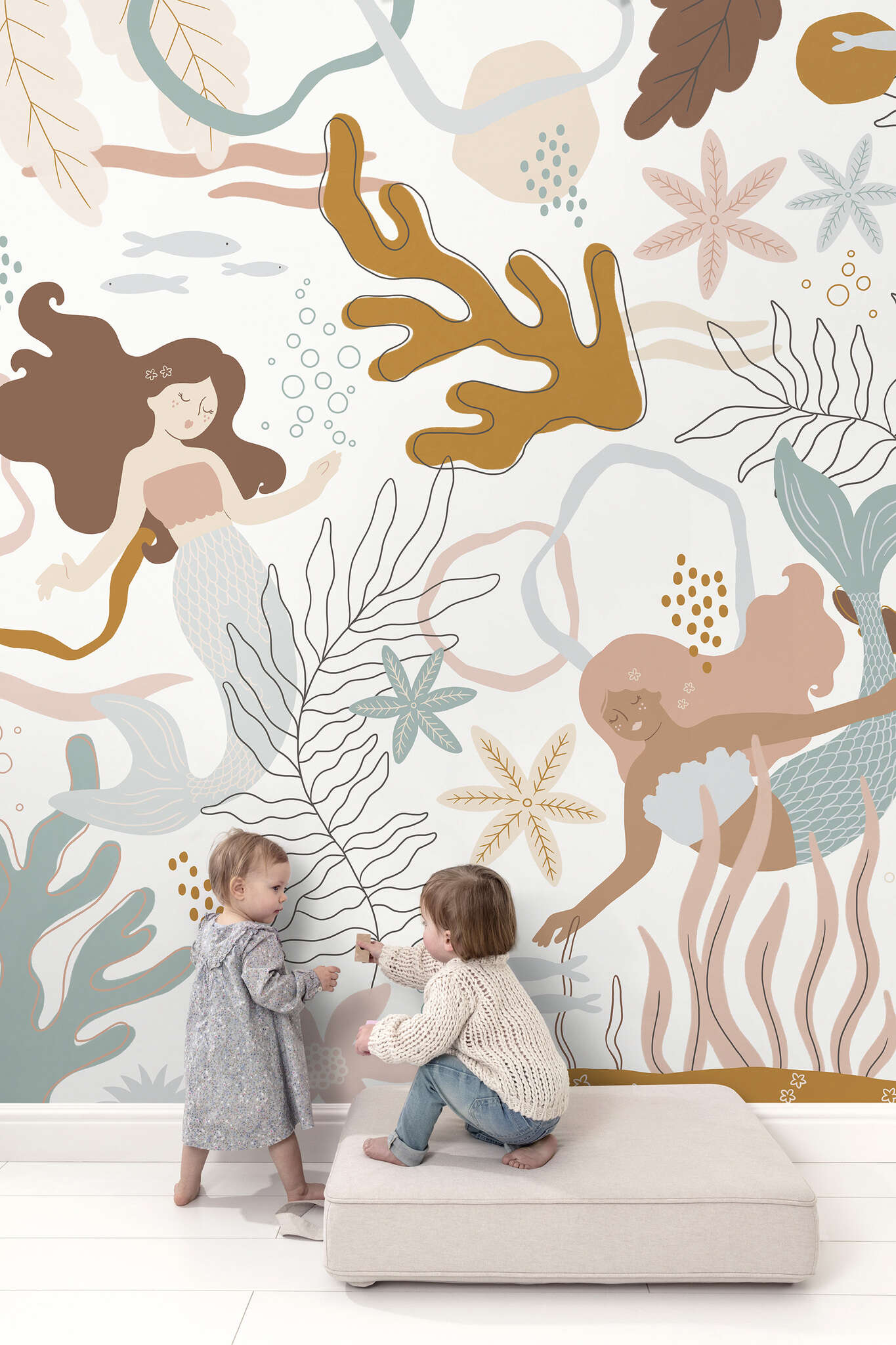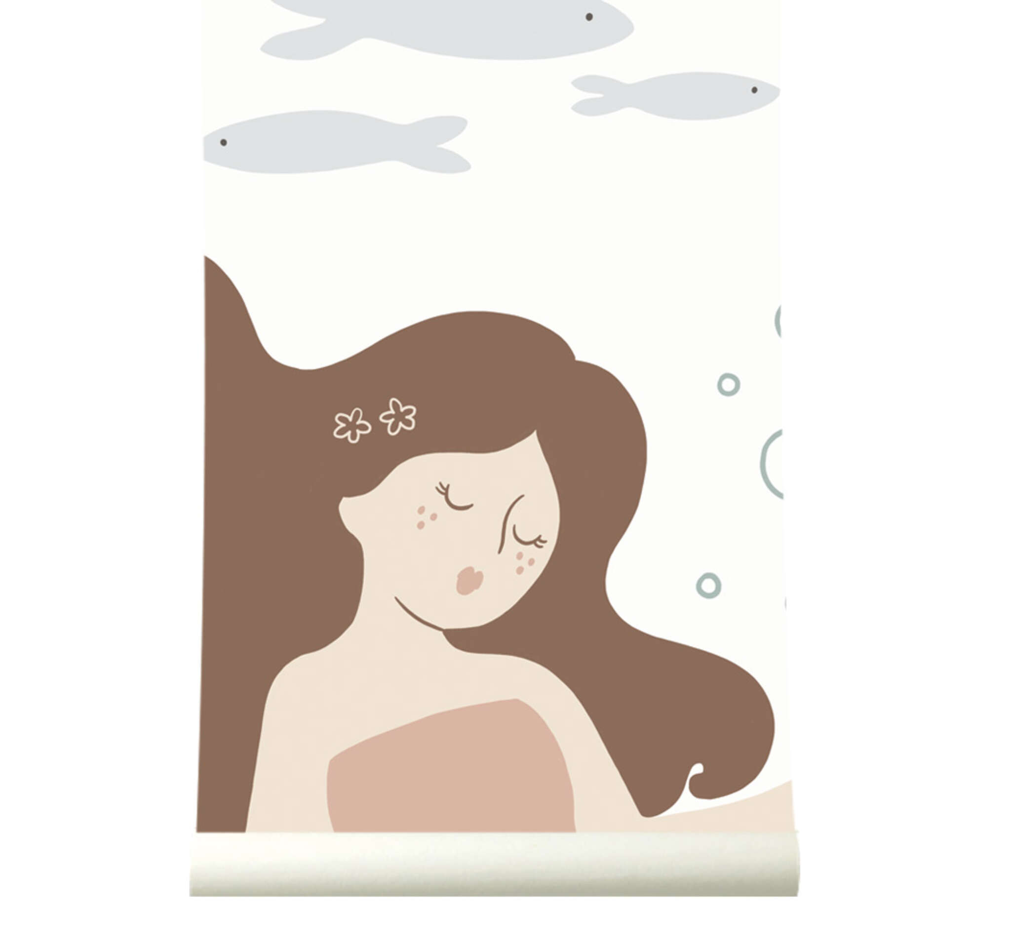Dive into the magical underwater world with the Mermaid wallpaper. You swim among the fish, plants and decorative mermaids in soft, timeless colours. Give your imagination free rein, because an eye-catcher like this on your wall evokes a flood of stories. The Mermaid wallpaper is a best seller in our sustainable Roomblush Recycled collection. The subtle specks refer to recycled paper fibres or sustainably grown cellulose pulp, a plant-based raw material.