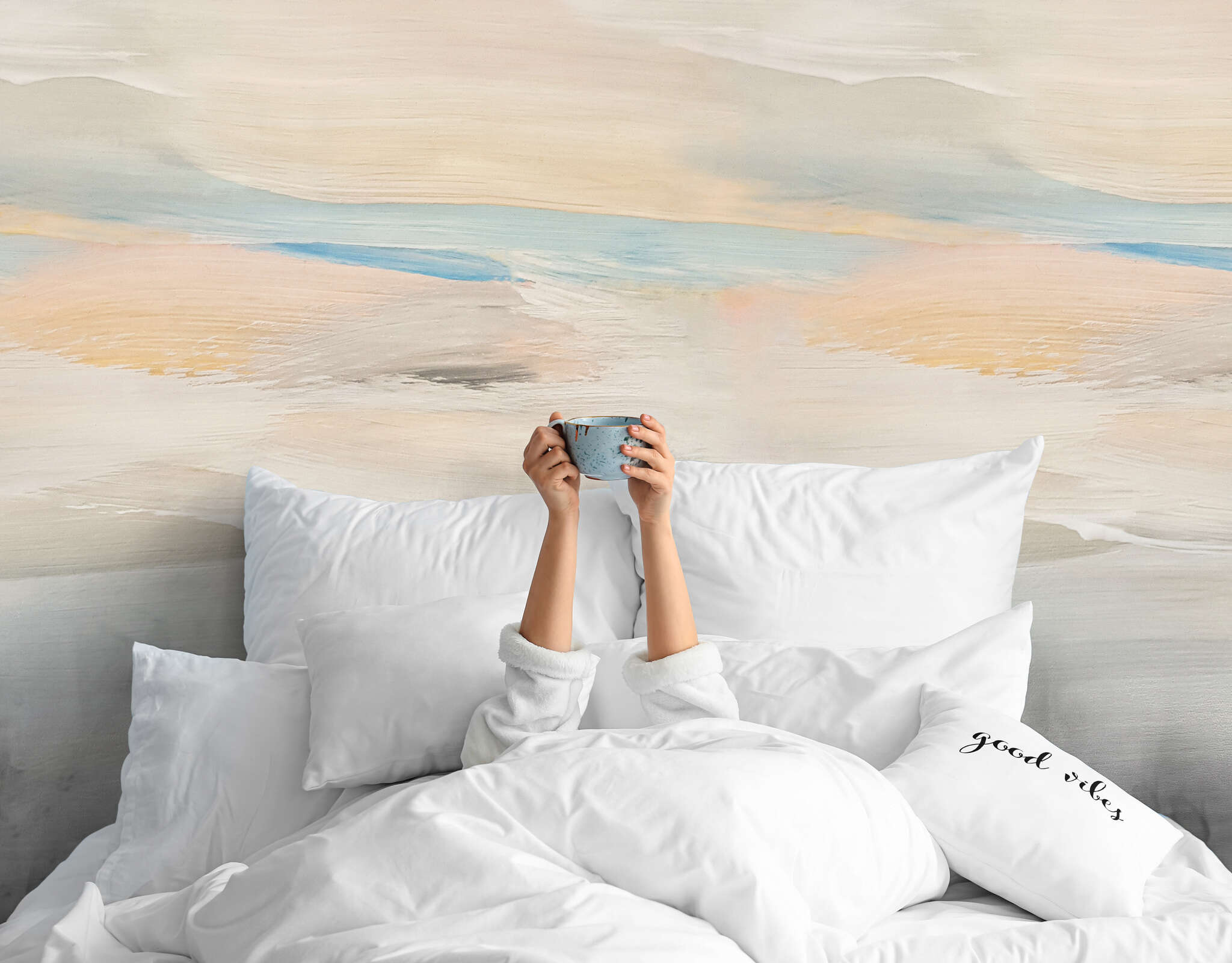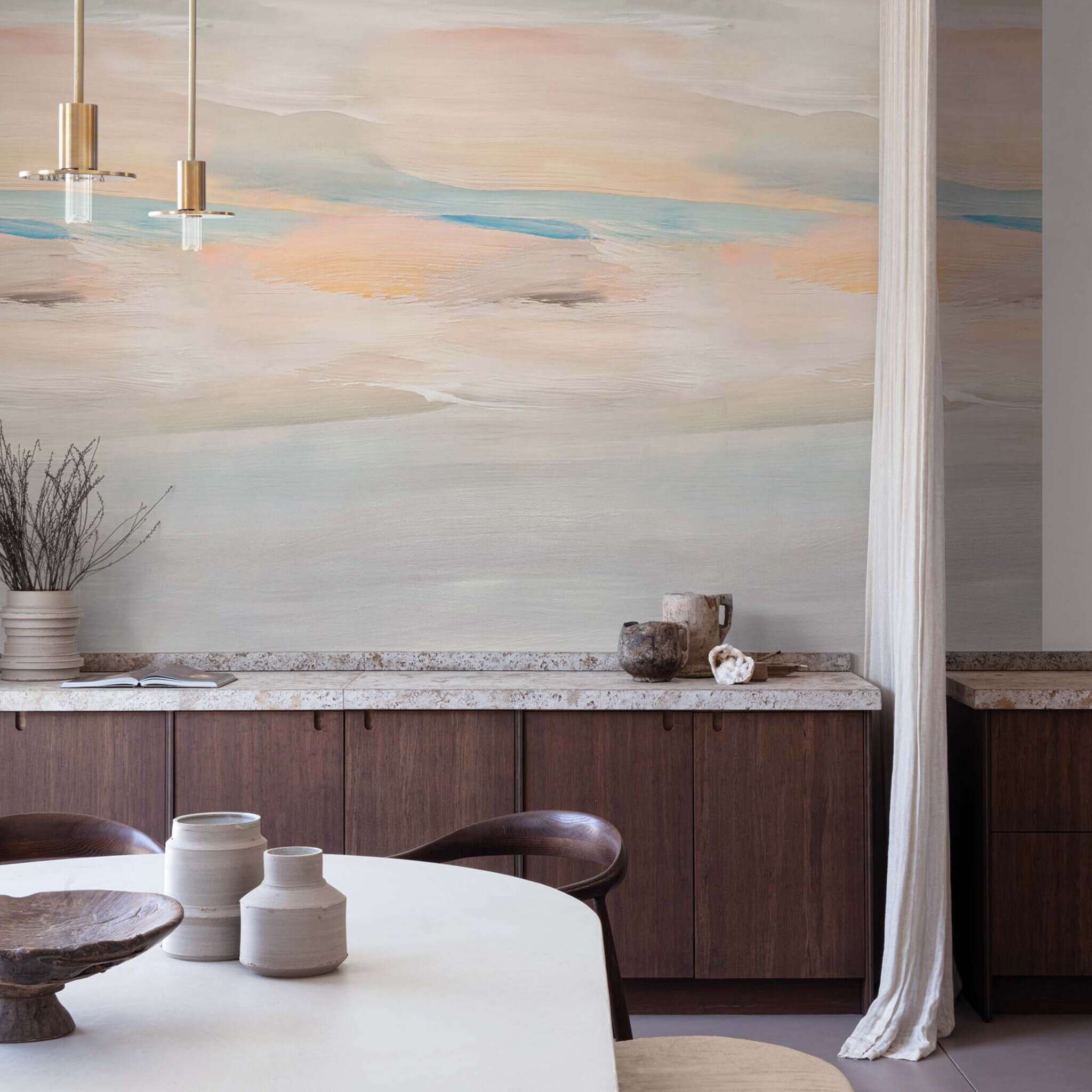 Entspannte Atmosphäre mit der Tapete Morning Glow. Diese Tapete strahlt mit ihrer harmonischen Kombination aus hellblauen und sanften orangefarbenen Pastelltönen eine entspannte Atmosphäre aus. Die subtilen Farbnuancen erzeugen einen erfrischenden Morgenlichteffekt, der jedem Raum eine ruhige und einladende Ausstrahlung verleiht. Runden Sie Ihren Raum mit dunklen Farbtönen ab, um einen schönen Kontrast zu schaffen, oder fügen Sie hellere Pastellfarben hinzu, die die beruhigende Atmosphäre der Wand noch weiter unterstreichen.