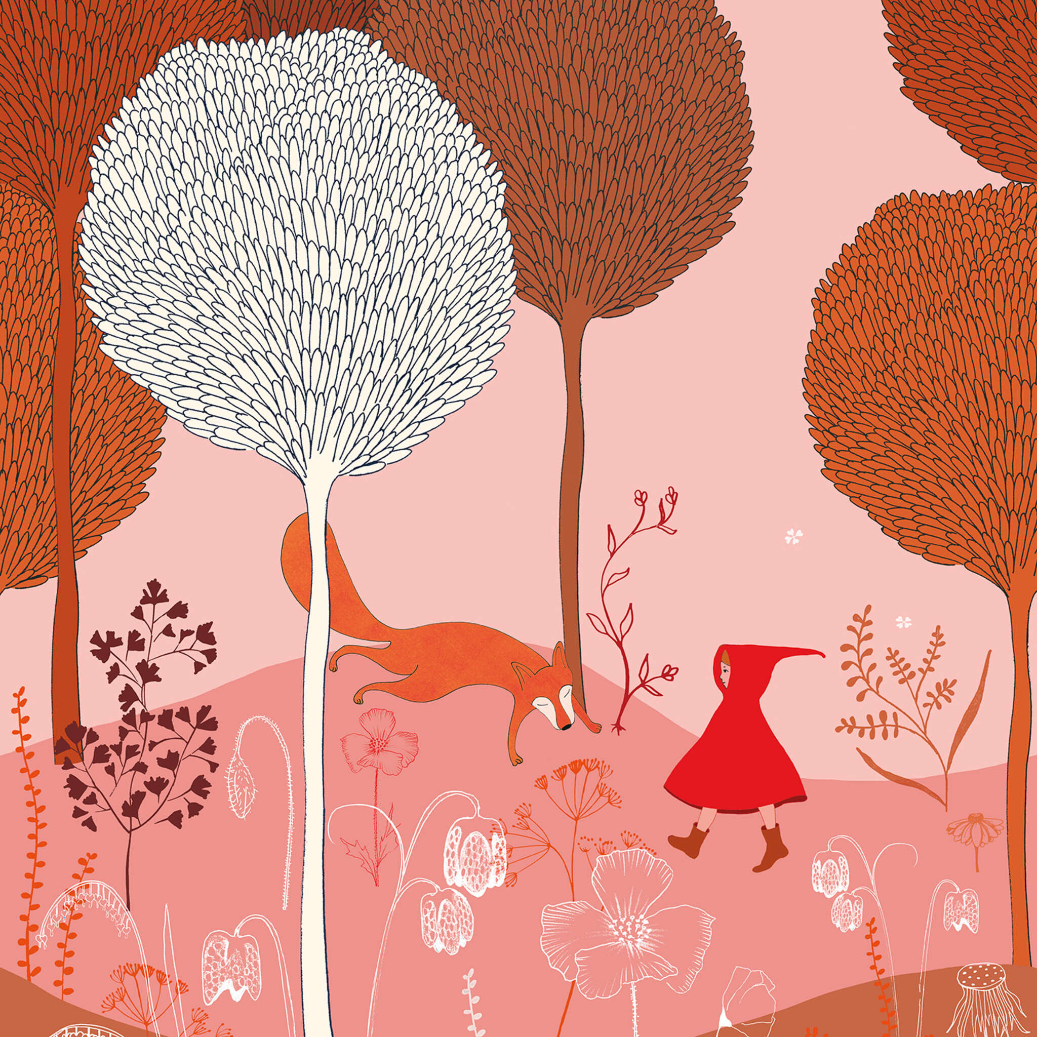 „Was hast du nur für ein hübsches Zuhause?“, fragte Rotkäppchen den Wolf, als es durch den herrlichen Wald spazierte. – Mit diesem Digitaldruck holt man sich sein eigenes Märchen vom Mädchen mit der roten Kappe in das Kinderzimmer. Wunderschöne Bäume und Blumen umgeben die Szene, die sich in einer traumhaften Farbgebung mit unterschiedlichen Rottönen und tollen Kontrasten in Weiß zeigt.
