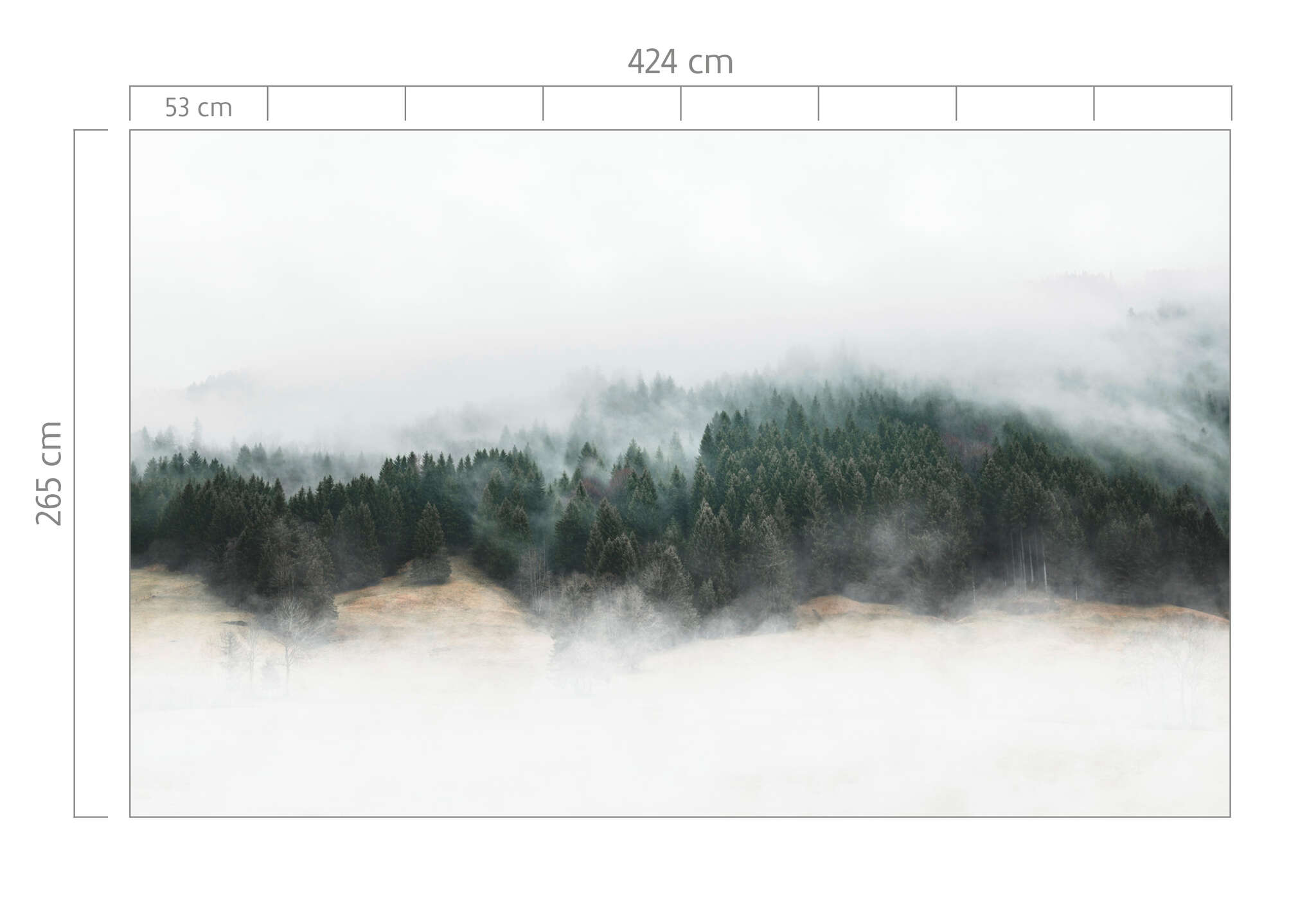 Eine Fototapete ist immer ein Hingucker. Wie wäre es diesmal mit einem augen- und seelenschmeichelnden Waldmotiv? Denn gerade Naturmotive sind wahre Allround-Talente. Sie schaffen eine frische, entspannte Wohnatmosphäre und heben gleichzeitig Wände eindrucksvoll hervor. Sanfte Grün- und Graunuancen bilden an der Wand einen edlen Background und lassen sich gut mit Materialien wie Holz, Beton und Stahl kombinieren. Wer eine kreative Alternative zur weißen Wand sucht, hat mit dieser Fototapete eine gute Wahl getroffen. Der dichte Tannenwald erstreckt sich, soweit das Auge reicht. Hier ist nur ein schmaler Landschaftsstreifen zu sehen, umhüllt von einer dichten Wolkendecke. Dadurch wird die Wand zur Decke und zum Boden hin mit Weiß abgeschlossen. Ein nahtloser Übergang auf andere Wände ist mit diesem Waldmotiv kein Problem. Für einen Hauch Farbe sorgen die hohen Tannen. In rauchigem Grün lugen sie aus den Wolken hervor. So ruhig und selbstbewusst, dass auch anstrengende Tage einfach im Nebel verblassen.