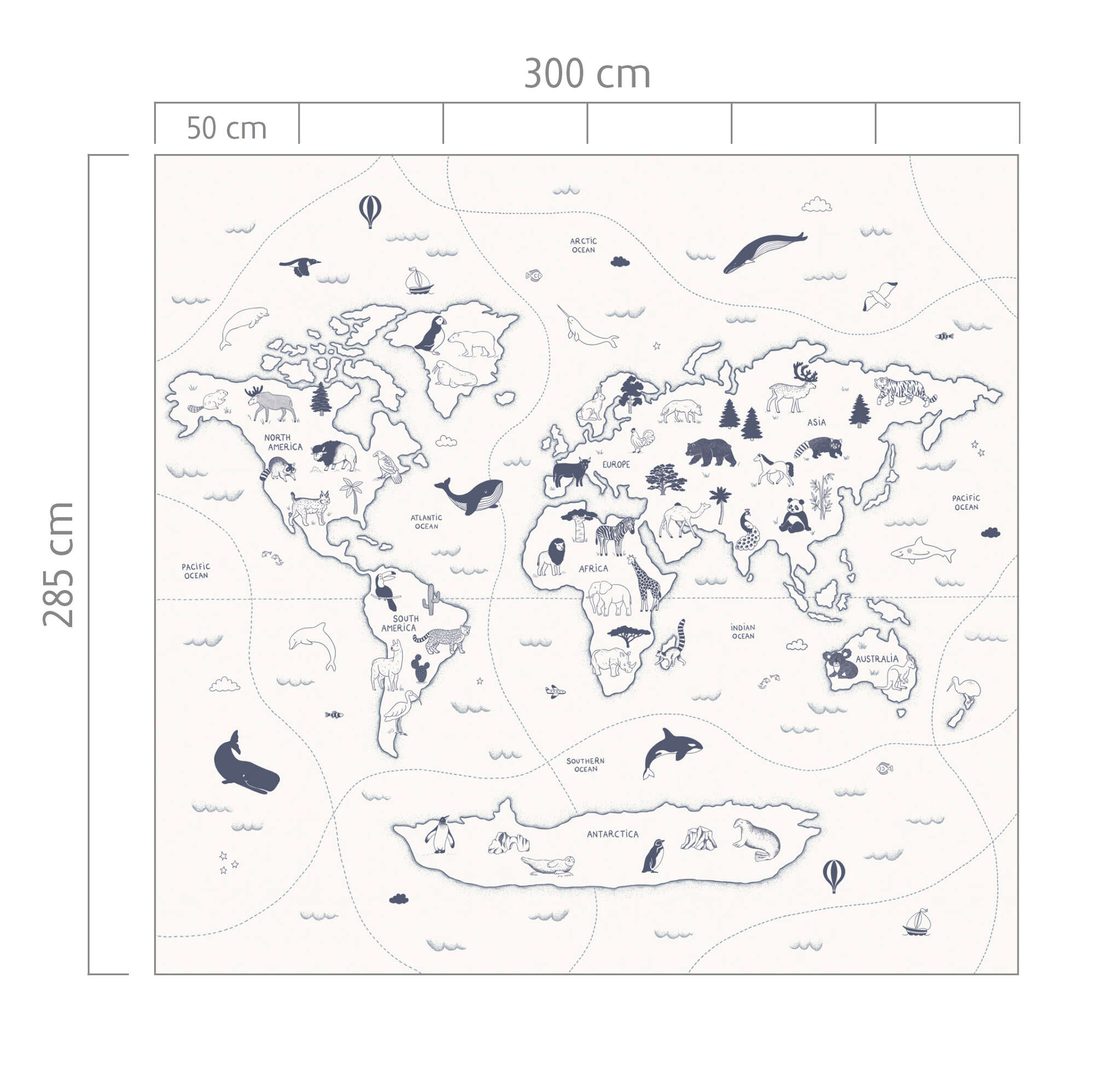 Die Tapete Animal World in Blau zeigt eine liebevoll illustrierte Weltkarte mit Tieren aus allen Kontinenten. In sanften Blautönen gehalten, vermittelt sie auf spielerische Weise Wissen über die Tierwelt – vom Eisbären in der Arktis über Elefanten in Afrika bis hin zu Kängurus in Australien. Kleine Details wie Boote, Wale und Heißluftballons verleihen dem Design eine lebendige, kindgerechte Note. Ideal für Kinderzimmer, die zum Entdecken, Lernen und Träumen einladen.