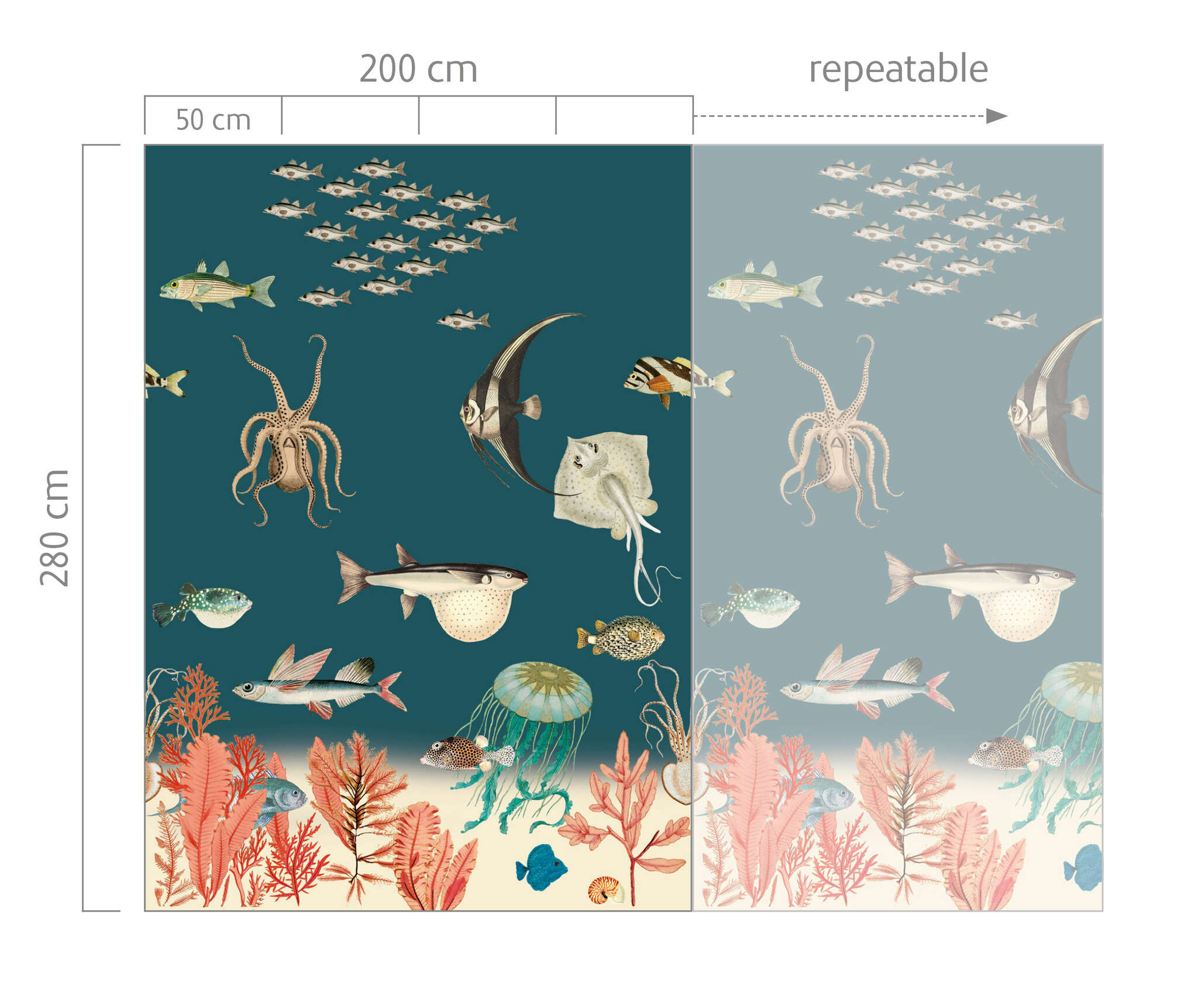Bereit zum Abtauchen? Die Unterwasserwelt ist eine Faszination für sich. Zahlreiche Meeresbewohner sind hier zuhause. Auf diesem Digitaldruck mit dem ozeanblauen Hintergrund tummeln sich Fische, Kraken, Quallen und Wasserpflanzen verschiedenster Arten. Die realistisch wirkenden Zeichnungen bringen ein stimmungsvolles Bild an die Wand und das nicht nur im Kinderzimmer.