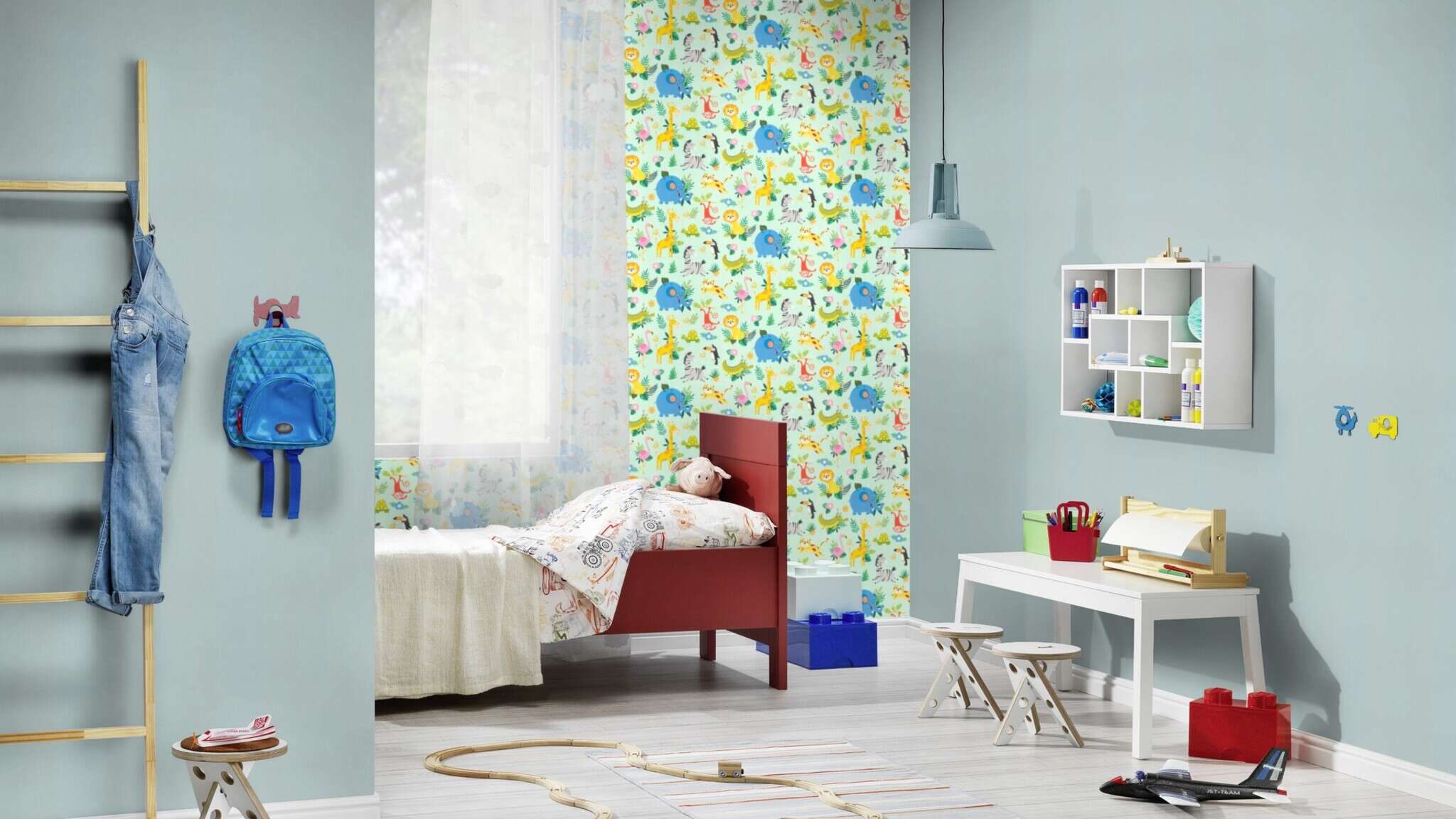 Das Leben ist bunt und wunderbar! Dank dieser wunderschönen und lebensfrohen Vliestapete zieht gute Laune in jedes Kinderzimmer ein. Auf dem mintgrünen Hintergrund kommen lustige Tiere, wie Elefant, Löwe, Krokodil, Zebra und zahlreiche mehr mit ansteckendem Lächeln daher. Großartige Zeichnungen mit brillanten Farben machen diese Wanddekoration zu einem Muss für alle Kinder, die Tiere lieben.