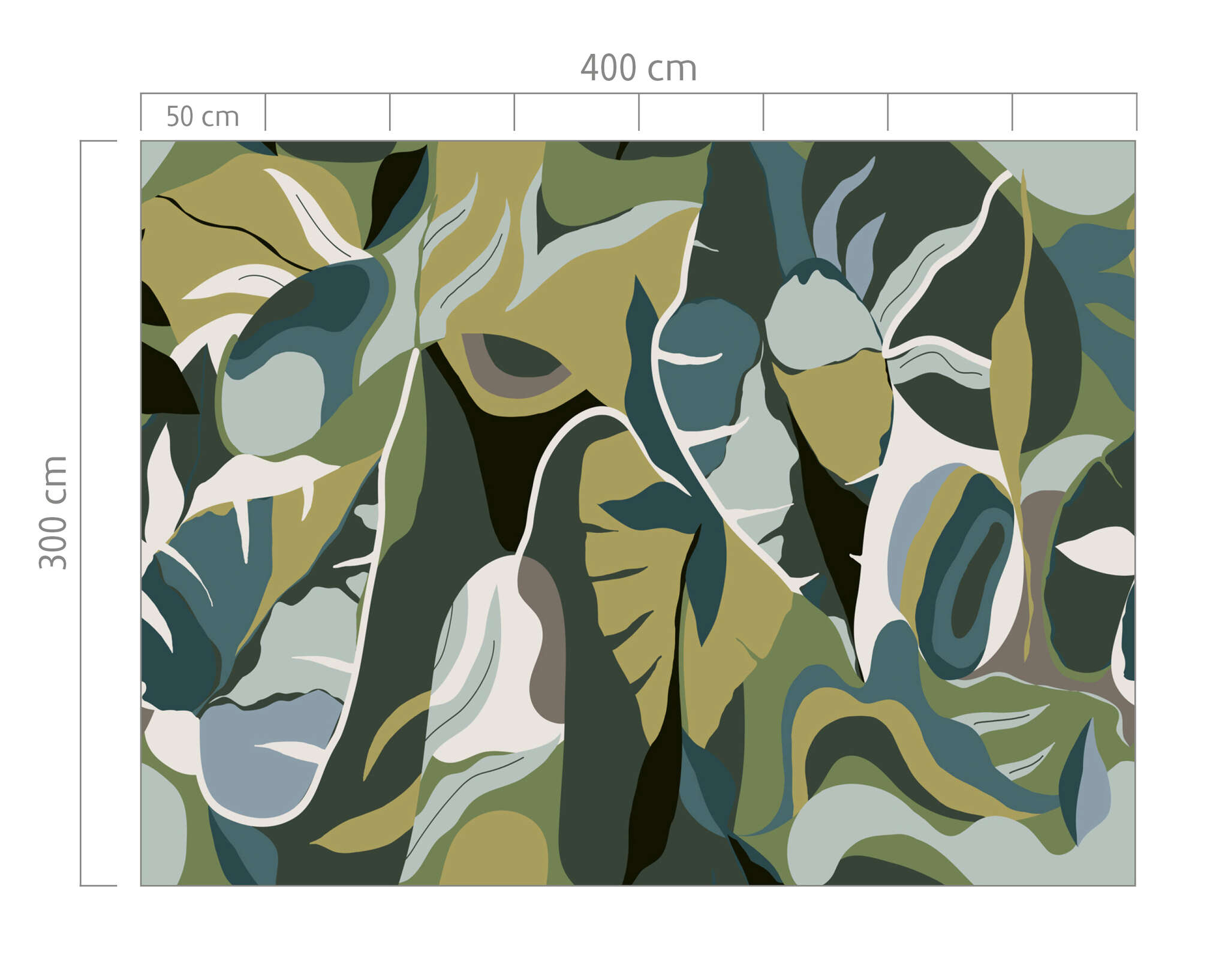 688184 Panoramique green Üppige Formen, kräftige Farben: hier darf es von allem ein bisschen mehr sein. Kein Wunder, dass dieses Wandbild eine bombastische Wirkung im Raum entfaltet. Blätter, Blüten und Stängel gehen fließend ineinander über und leuchten in verschiedenen Grün- und Blautönen. So entsteht ein Gemälde, das wunderbar aus dem Rahmen fällt und sich auf der ganzen Wand ausbreiten darf.