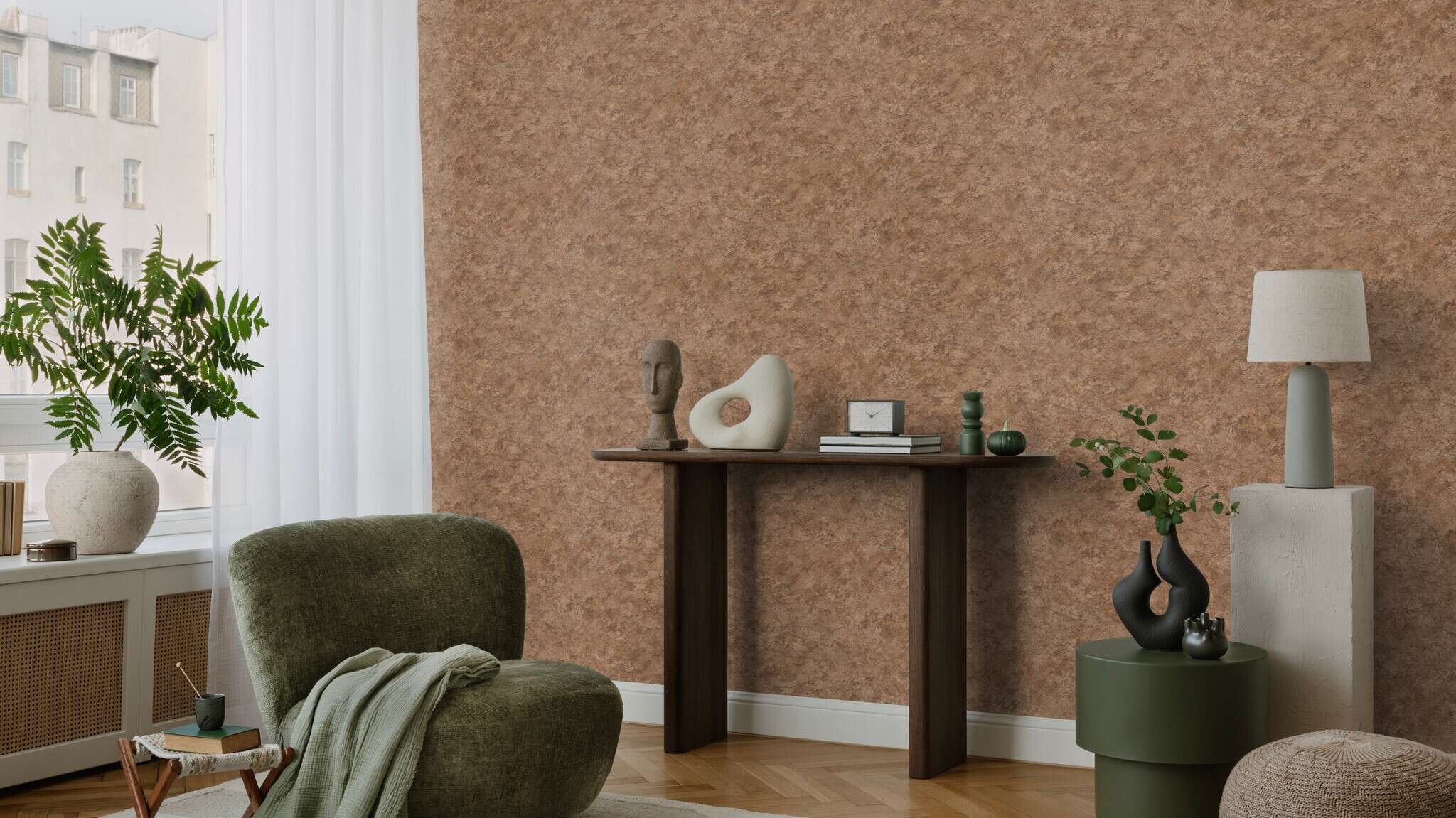 Terra bringt die Ursprünglichkeit der Erde an die Wand. Die lebendige Struktur mit feinen Rissen und natürlichen Schattierungen erinnert an Stein, Sand und verwitterte Oberflächen. Ein Design voller Wärme und Authentizität das Räumen Tiefe und Natürlichkeit verleiht.