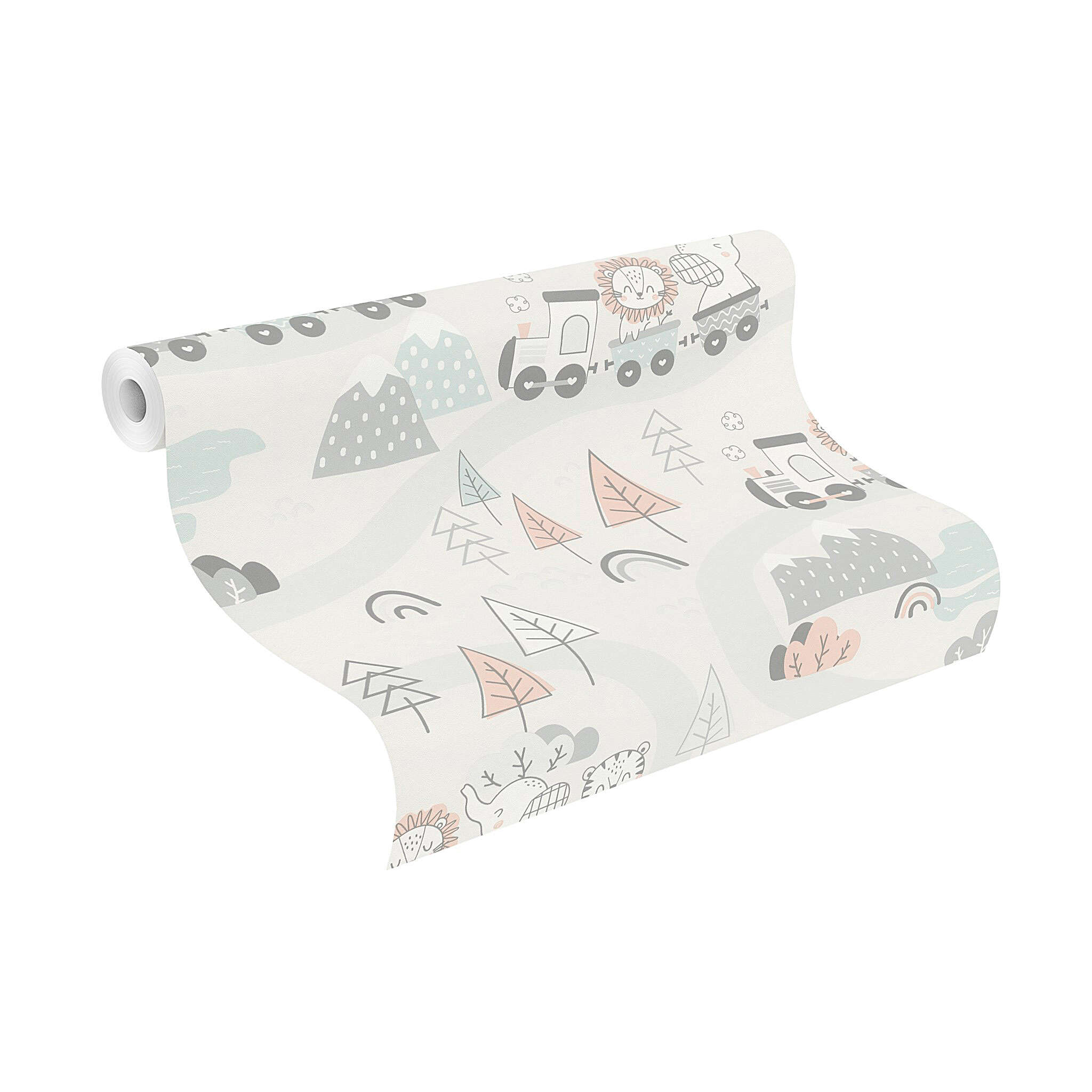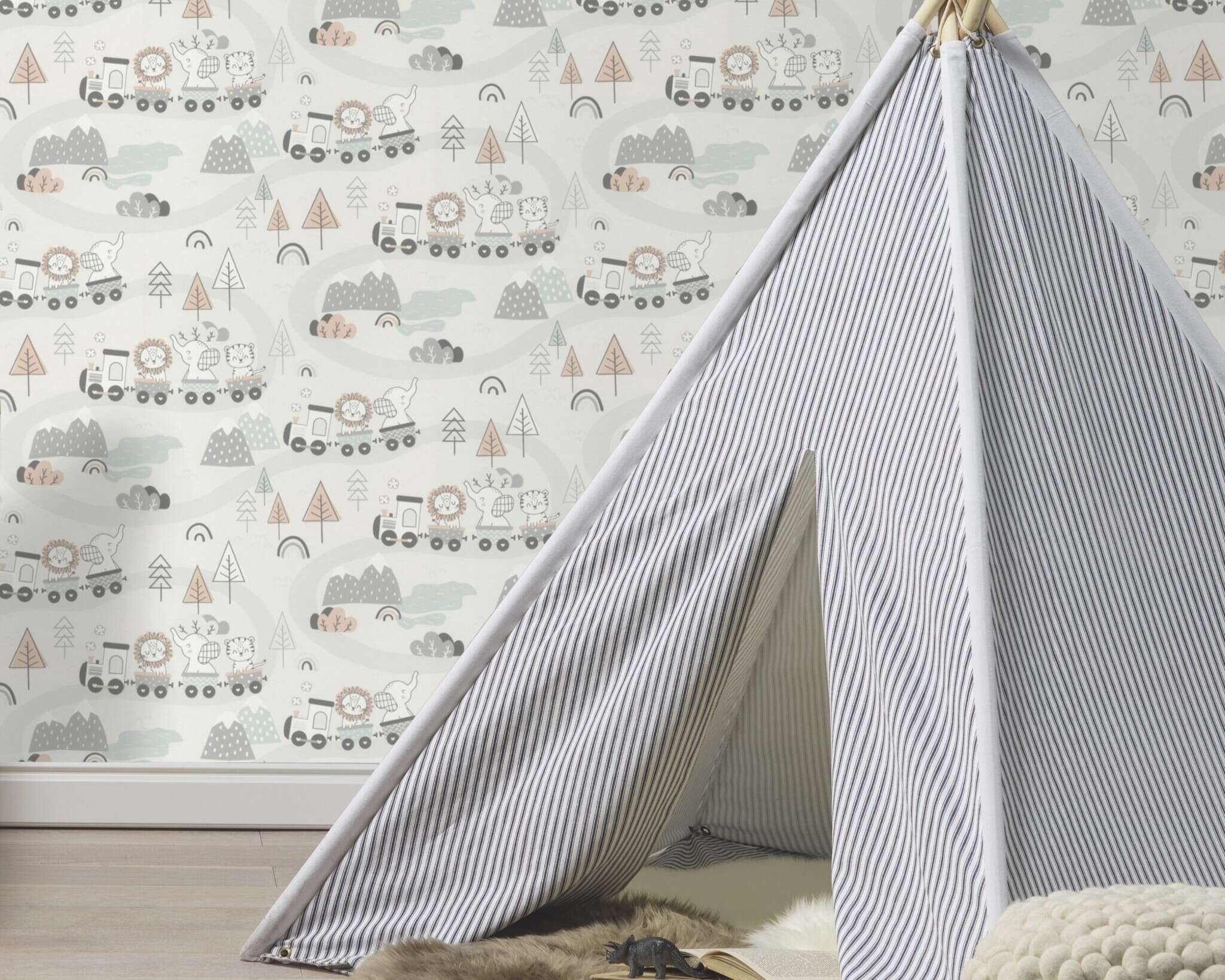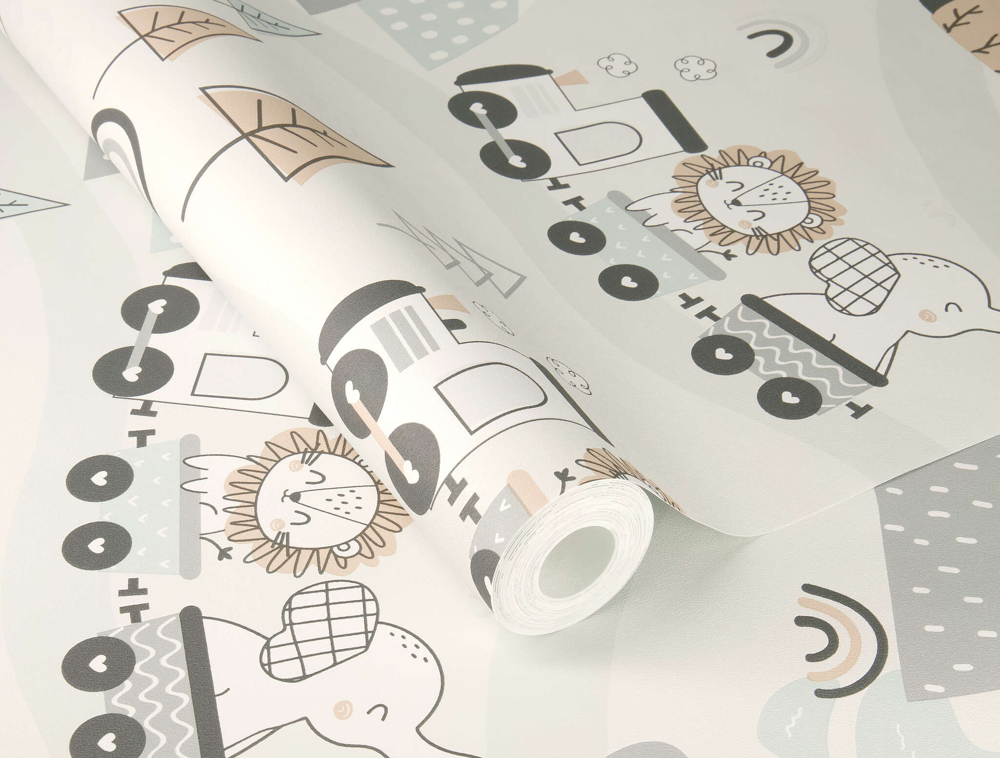 Diese bezaubernde Vliestapete bringt kindliche Freude und Abenteuerlust ins Kinderzimmer. Das verspielte Design zeigt einen liebevoll gezeichneten Zug mit niedlichen Tierfiguren – einem Löwen, einem Elefanten und einem Tiger – die fröhlich durch eine zauberhafte Landschaft mit Bergen, Bäumen und Regenbögen fahren. Die zarten Farben in sanften Grautönen, Pastellblau und Rosé sorgen für eine beruhigende und freundliche Atmosphäre. Ideal für kleine Entdecker, die von fantasievollen Reisen und Abenteuerträumen begleitet werden möchten. Dank der hochwertigen Verarbeitung ist die Tapete leicht anzubringen und langlebig.