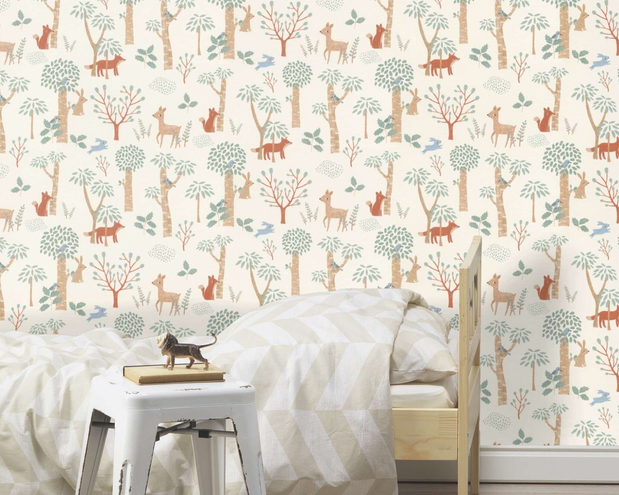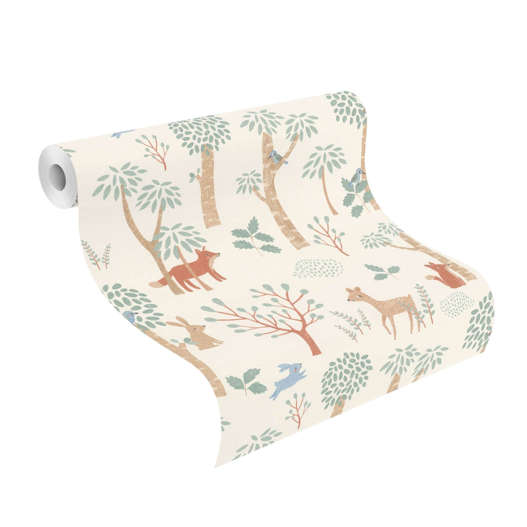 Diese charmante Vliestapete bringt die friedliche Atmosphäre eines Waldes ins Kinderzimmer. In sanften Naturtönen wie Beige, Braun, Blau und Grün zeigt sie liebevoll gezeichnete Tiere wie Rehe, Hasen, Füchse und Vögel, die sich zwischen stilisierten Bäumen und Sträuchern verstecken. Die kindgerechten Illustrationen strahlen Wärme und Geborgenheit aus und schaffen eine naturnahe, beruhigende Umgebung für kleine Entdecker. Die Tapete ist hochwertig verarbeitet, leicht zu tapezieren und sorgt für eine harmonische Einrichtungsidee im Kinderzimmer.