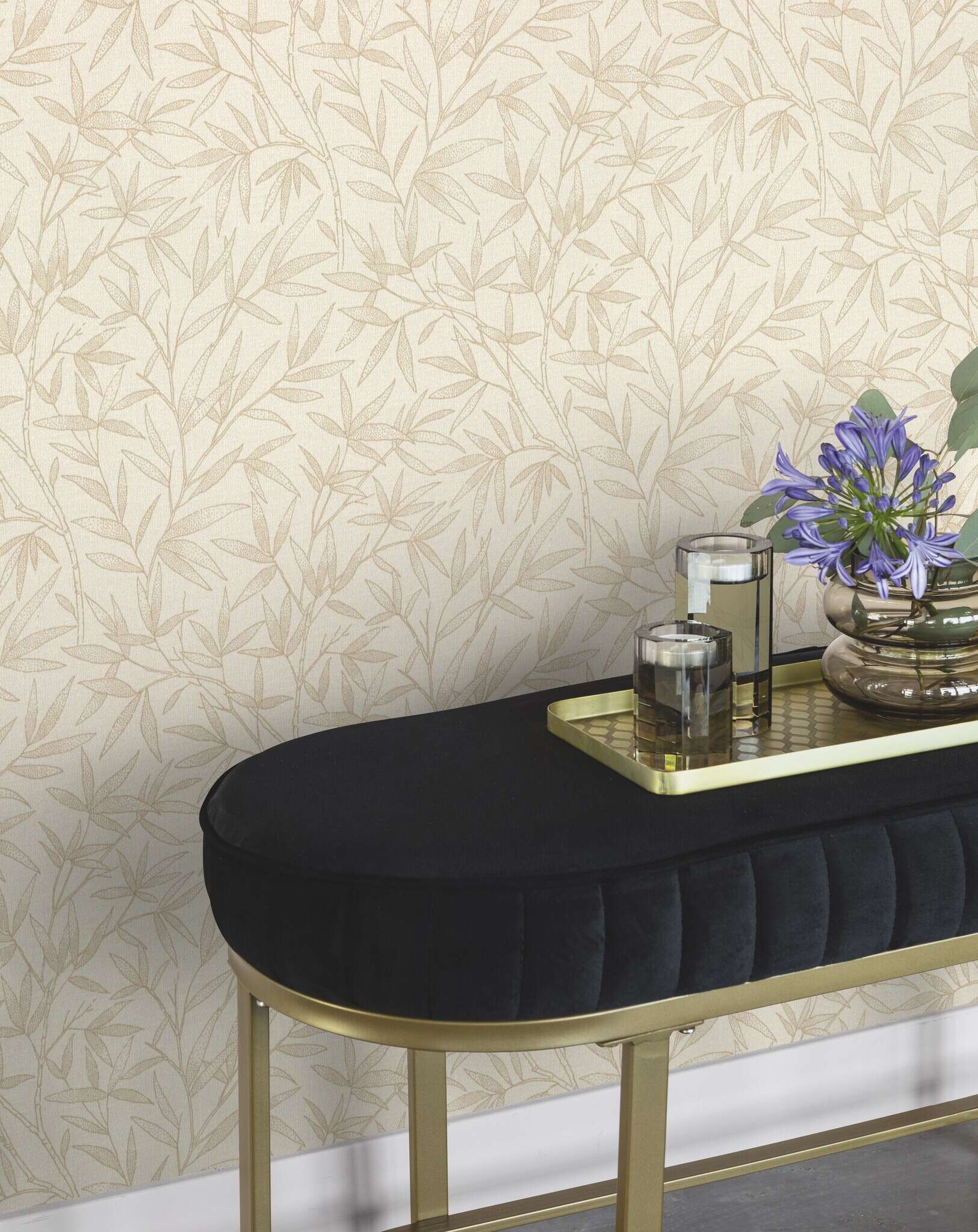 Diese Tapete präsentiert ein sanftes, beruhigendes Design, das von zarten Bambuszweigen in einem warmen Beige-Ton geprägt ist. Die feinen, grafisch gezeichneten Blätter verleihen dem Raum eine elegante, natürliche Atmosphäre. Durch den hellen, neutralen Hintergrund wirkt die Tapete subtil und harmonisch, wodurch sie perfekt in Räume passt, die eine ruhige, aber dennoch stilvolle Ausstrahlung benötigen. Ideal für Wohnzimmer oder Schlafzimmer, wo sie für eine entspannte, gemütliche Stimmung sorgt.