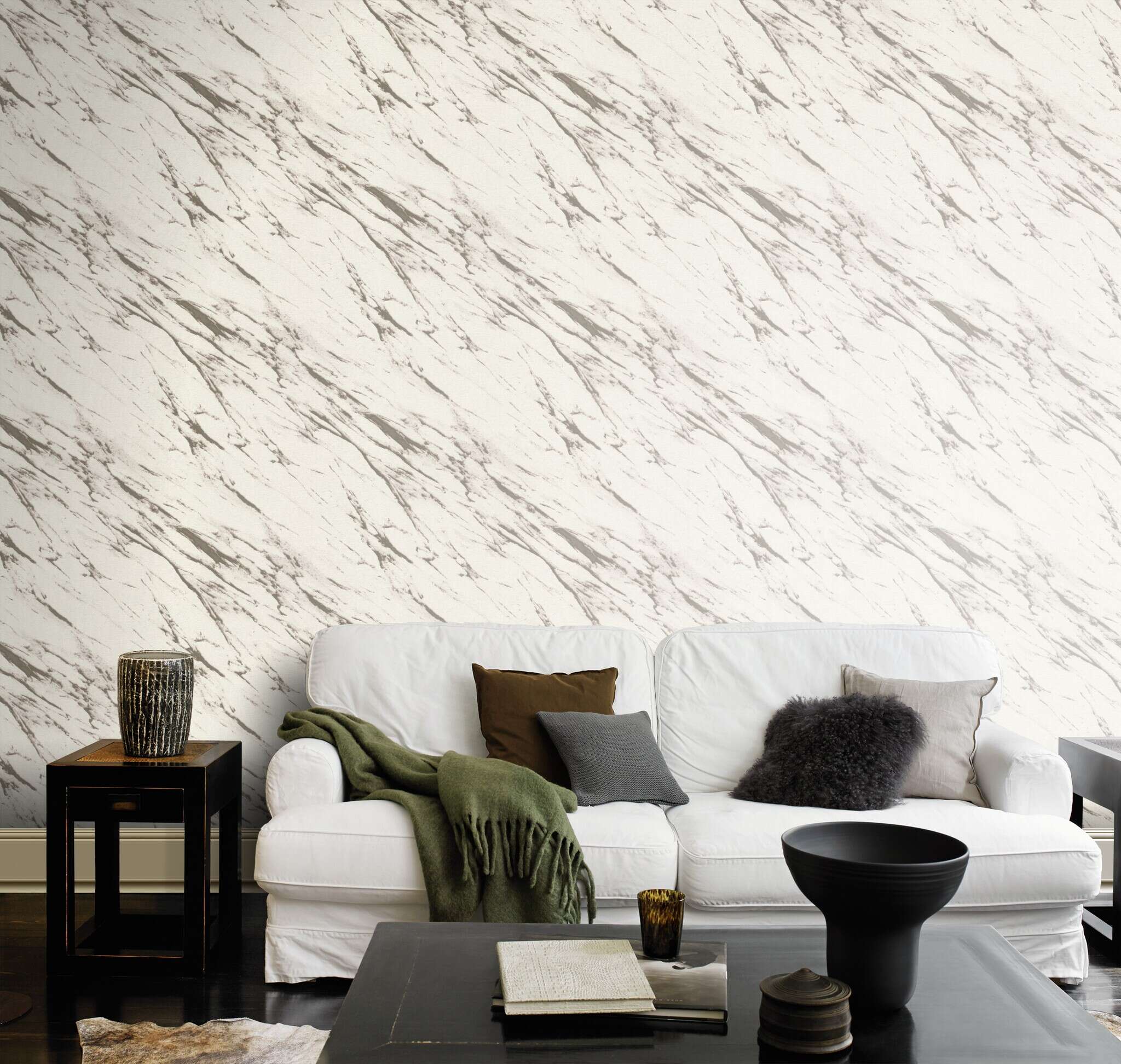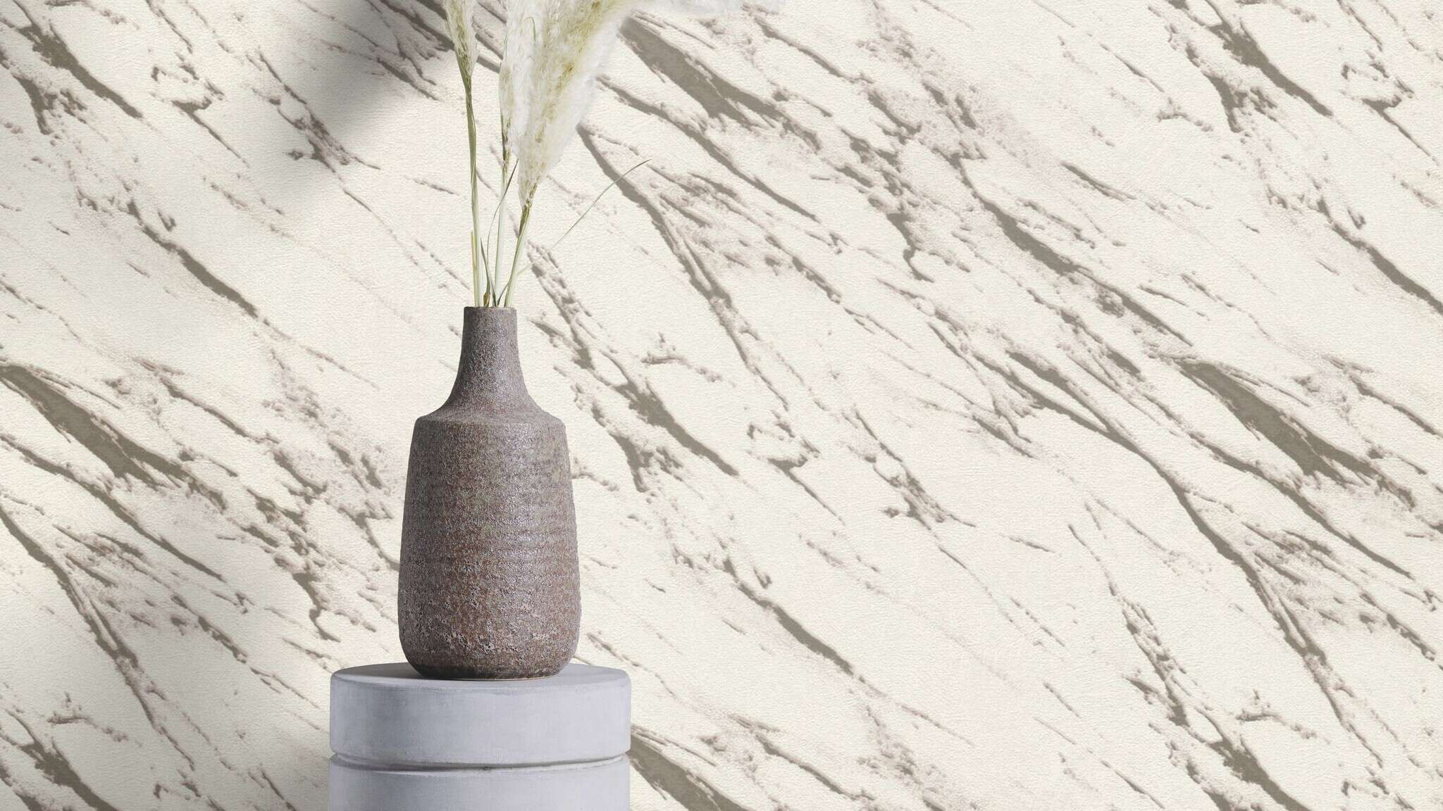 This wallpaper impresses with a modern marble look in a harmonious interplay of cream-coloured base tones and warm grey veins. The natural grain runs diagonally, creating a slight movement across the surface without appearing restless. Ideal for an elegant and timeless room design – whether used as a stylish accent wall or over a large area, it brings a refined, calm atmosphere to any living space.