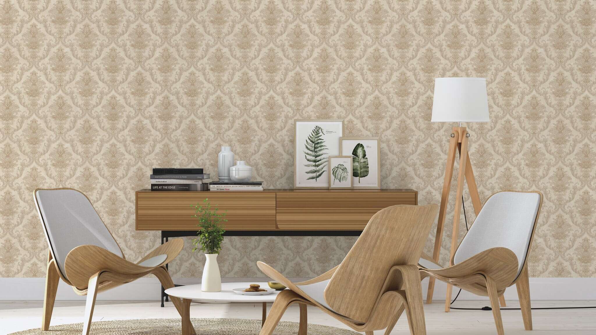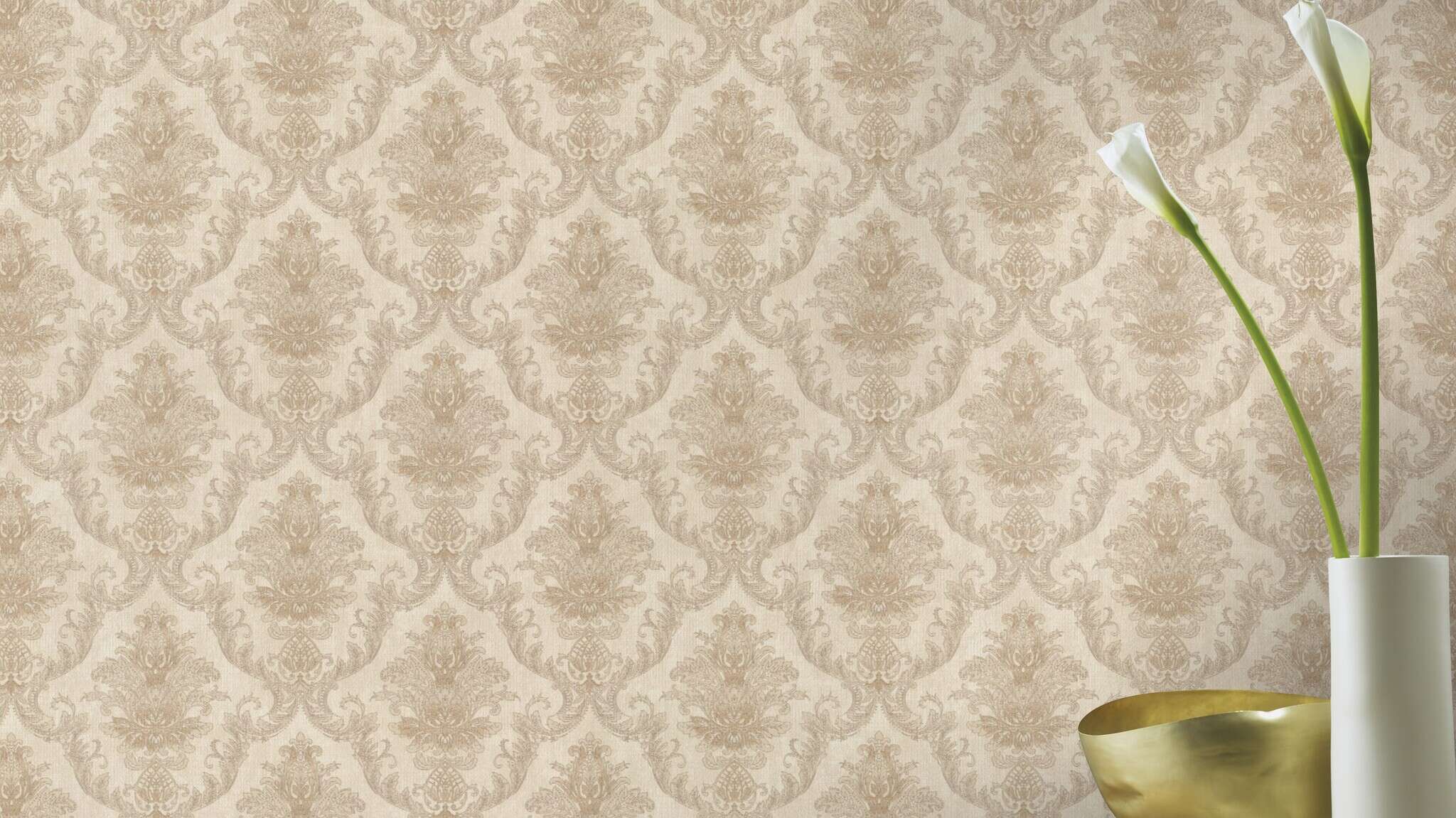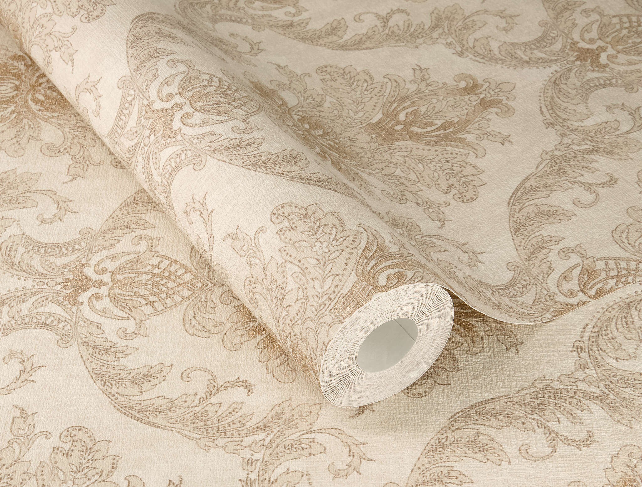 With its opulent damask pattern and golden accents, this wallpaper brings a touch of luxury and warmth to any room. The delicate floral ornaments in soft beige tones, combined with golden details, give the wallpaper an elegant look that is both opulent and classic. The elegant sheen of the golden elements adds a special depth and brings the pattern to life. Perfect for formal rooms such as living rooms, dining rooms or representative hallways where a luxurious and stylish atmosphere is desired. Its warm colour scheme also makes this wallpaper an excellent choice for bedrooms, creating a welcoming yet sophisticated mood.
