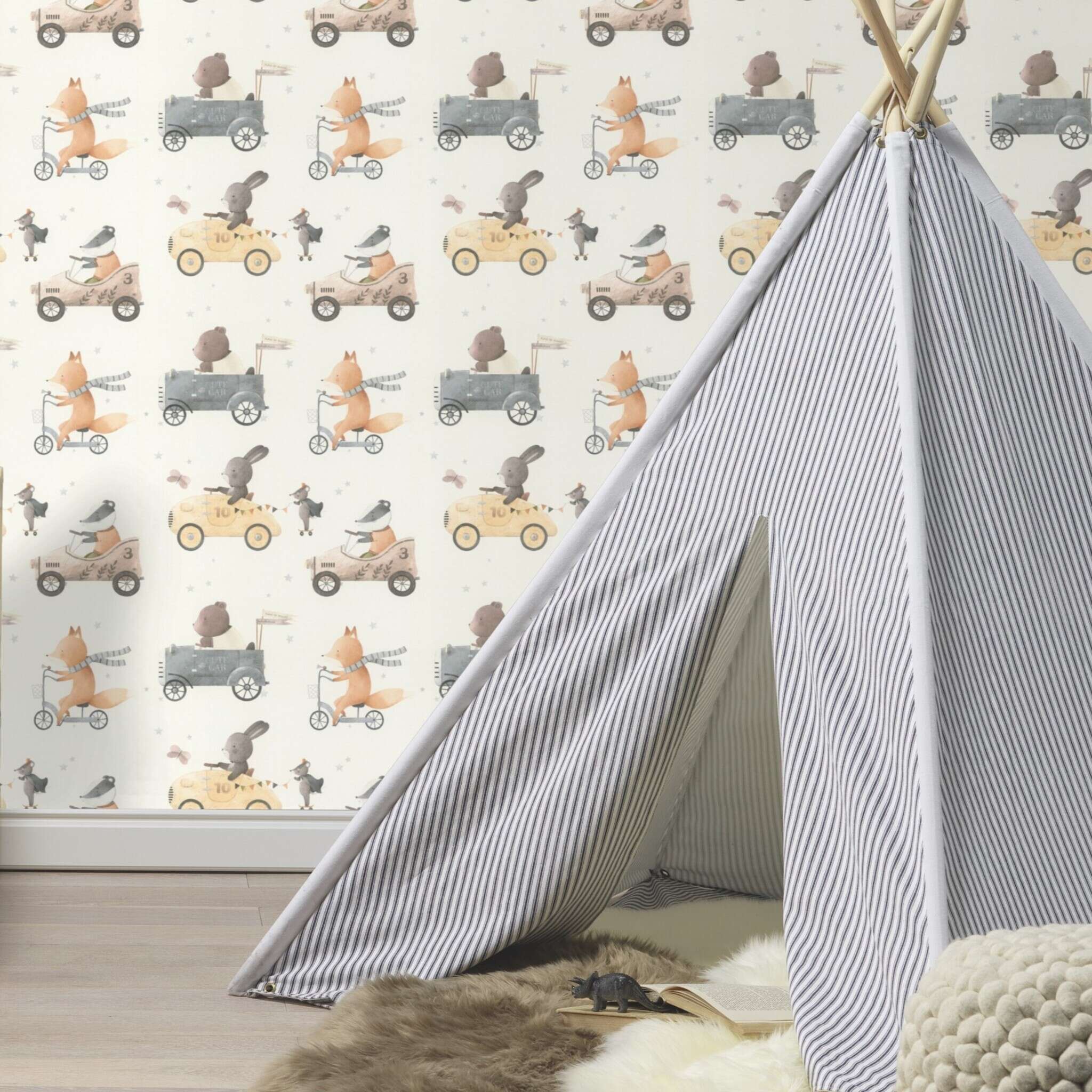 Diese bezaubernde Vliestapete verleiht jedem Kinderzimmer eine fröhliche und verspielte Atmosphäre. Liebevoll gestaltete Tierfiguren – ein Bär, ein Fuchs, ein Hase, ein Dachs und eine Maus – fahren in charmanten Retro-Fahrzeugen durch eine sanft gemusterte Szenerie mit kleinen Sternen und Schmetterlingen. Die warmen, gedeckten Farbtöne und die zarten Aquarellelemente schaffen eine freundliche und beruhigende Umgebung, die zum Träumen und Entdecken einlädt. Perfekt, um das Kinderzimmer in einen fantasievollen Spielraum zu verwandeln. Die hochwertige Vliesqualität garantiert eine einfache Anbringung und langlebige Freude.