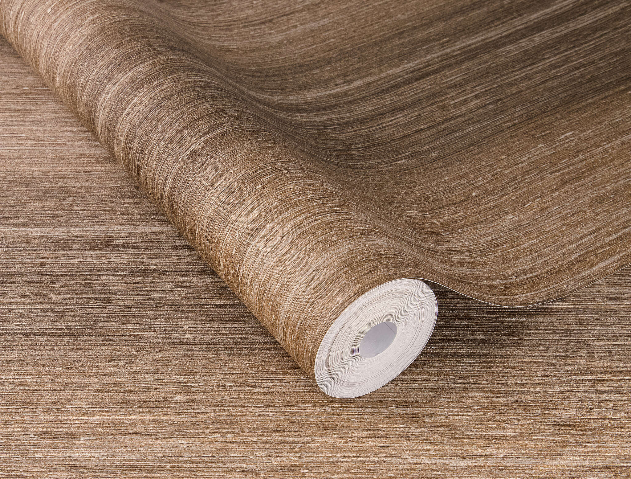 This wallpaper impresses with its warm brown colour scheme and a subtle vertical striped pattern reminiscent of textured wood or woven fabric. The slightly iridescent tones and subtle texture give it a natural, elegant look – perfect for combining cosiness with style. Whether as an accent wall in the living room, home office or for a cosy bedroom, this wallpaper brings warmth to any room and can be combined beautifully with both neutral and stronger colours. Ideal for anyone who wants to create a modern yet cosy atmosphere.