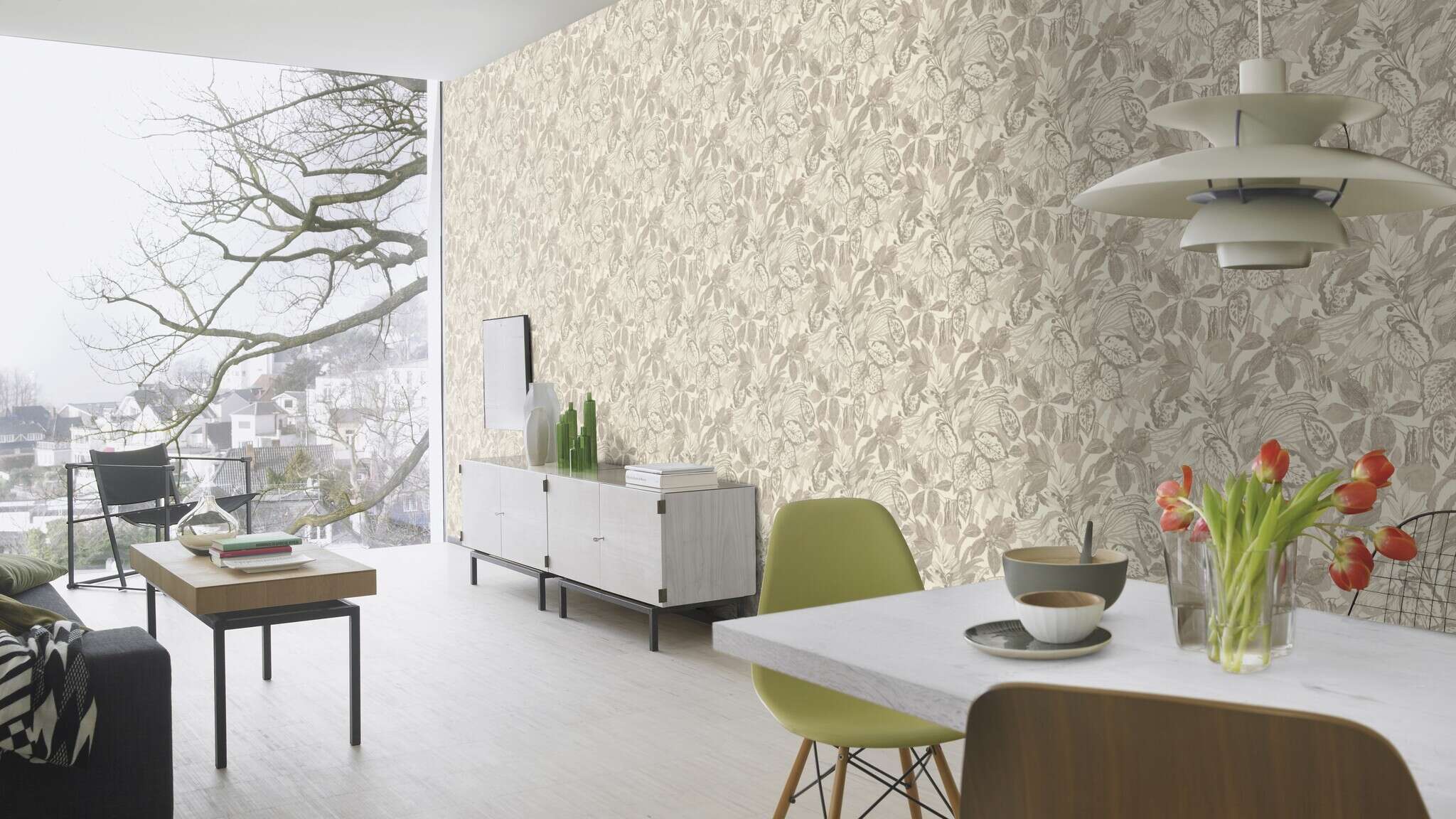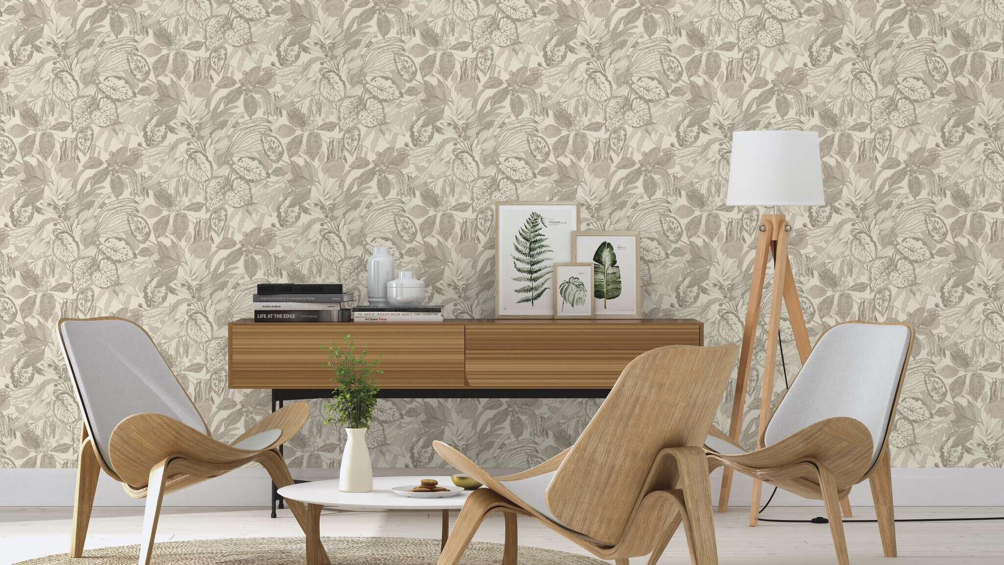 Die Tapete zeigt ein sanftes florales Muster in beruhigenden Beigetönen. Feine Linien und zarte Schattierungen von Pflanzen und Blättern verbinden sich zu einem eleganten, natürlichen Design. Die Blumen und Blätter sind in detaillierter Zeichnung angeordnet und schaffen eine organische Textur, die dem Raum eine subtile, aber eindrucksvolle Atmosphäre verleiht. Ideal für jeden Raum, der eine warme und gleichzeitig stilvolle Wirkung erzielen soll. Die gedeckten Farben passen sowohl in moderne als auch in klassische Innenräume.