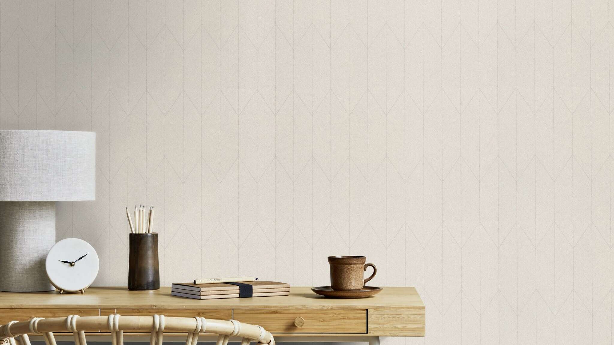 Mit ihrem klaren, geometrischen Muster in einem eleganten Hellgrau bringt diese Tapete moderne Struktur in jeden Raum. Die feine Linienführung in Form eines stilisierten Pfeil- oder Fischgrätmusters verleiht der Oberfläche eine subtile Dynamik, während die textile Anmutung für eine weiche, wohnliche Wirkung sorgt. Das dezente Farbspiel zwischen Muster und Hintergrund bleibt bewusst zurückhaltend und lässt die Wandgestaltung zugleich hochwertig und ruhig erscheinen. Besonders geeignet für minimalistische Interieurs, Home-Offices oder moderne Wohnbereiche, in denen Klarheit und Leichtigkeit dominieren sollen. Die Tapete lässt sich vielseitig kombinieren und fügt sich nahtlos in unterschiedlichste Stilrichtungen ein.