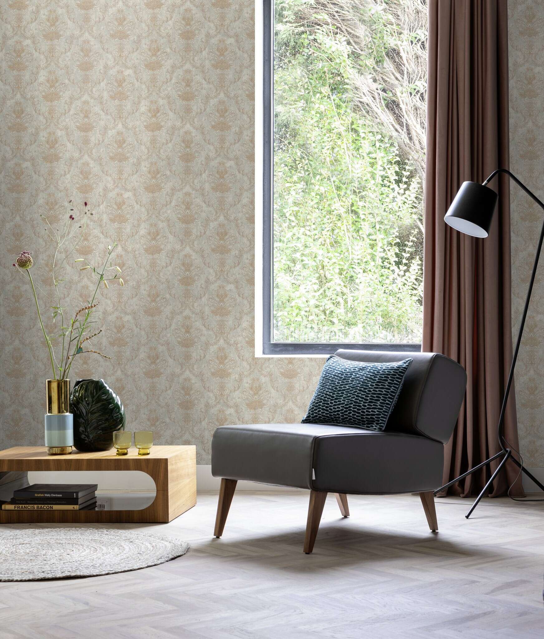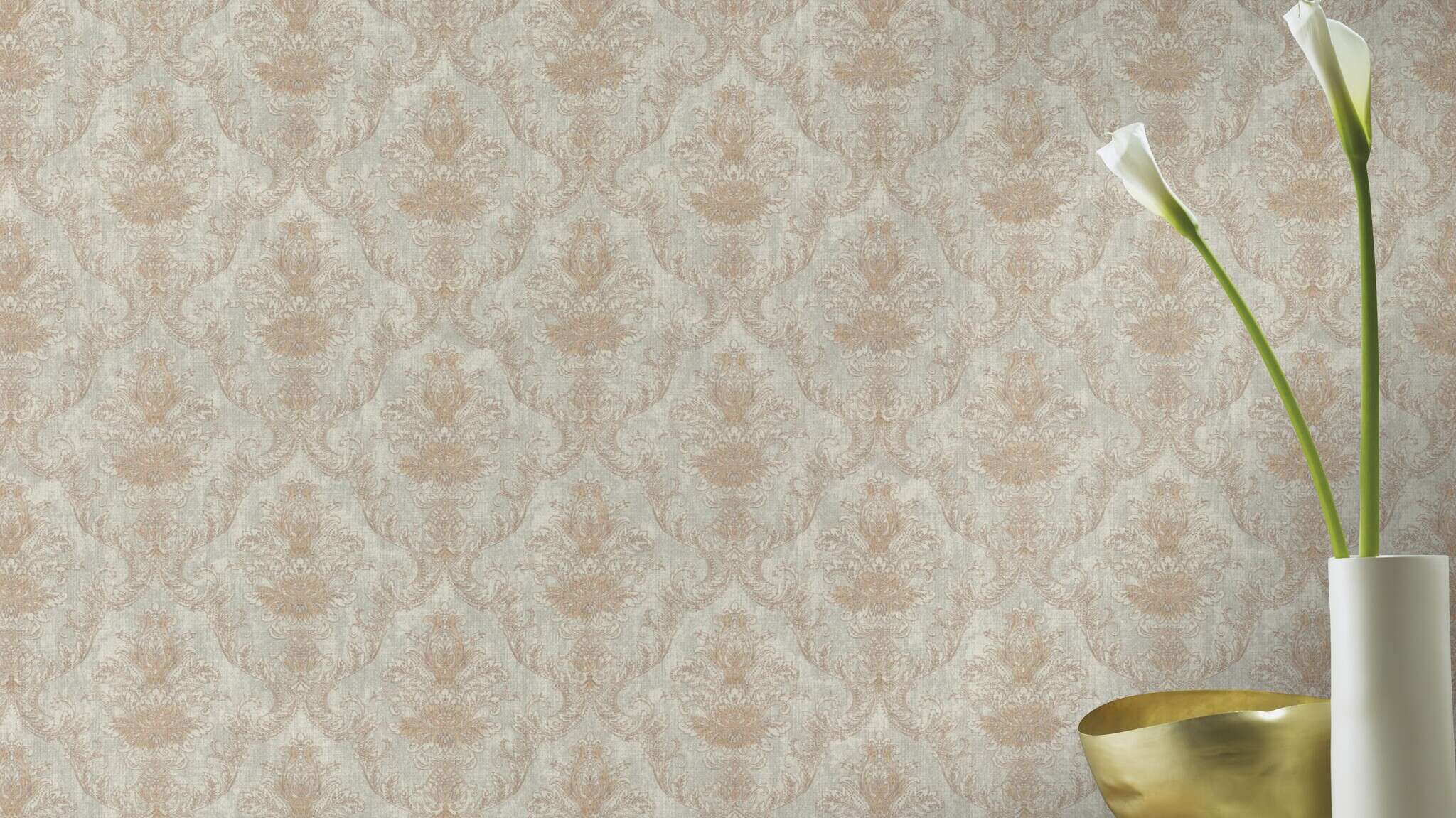 This wallpaper with a stylish damask pattern in warm beige and gold tones on a silver background brings luxurious charm to any room. The delicate, baroque ornaments exude refined elegance and lend the wall a noble depth. The shimmering silver background provides a modern flair, while the golden details make the design appear opulent and festive. This wallpaper is ideal for rooms where a sophisticated yet warm ambience is desired – such as living rooms, dining rooms or even stylish bedrooms. The timeless colour scheme allows for effortless combination with various interior styles, from classic to modern.