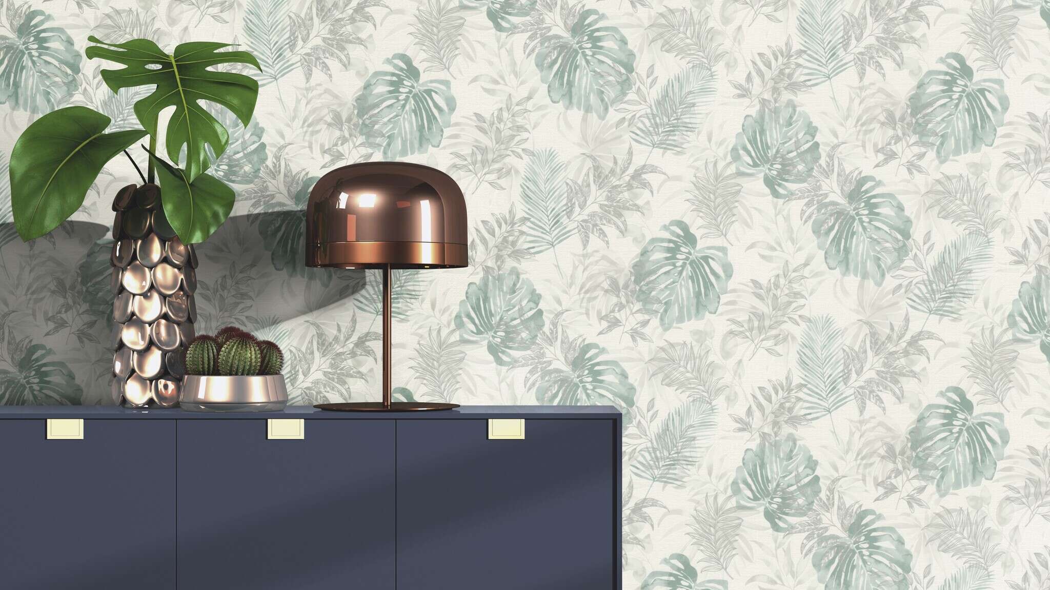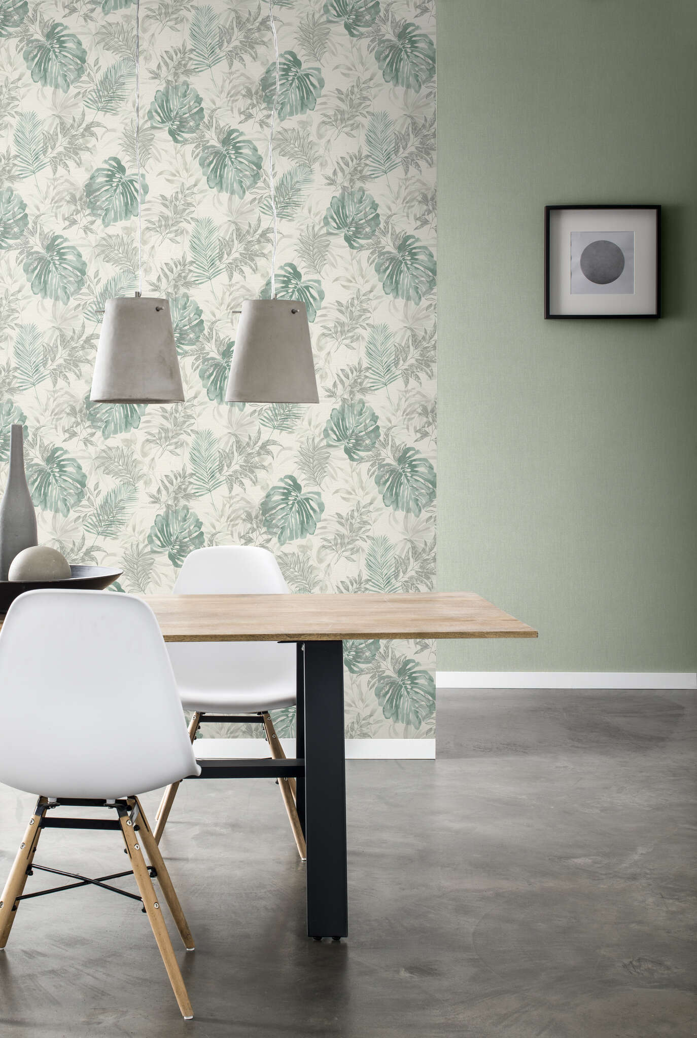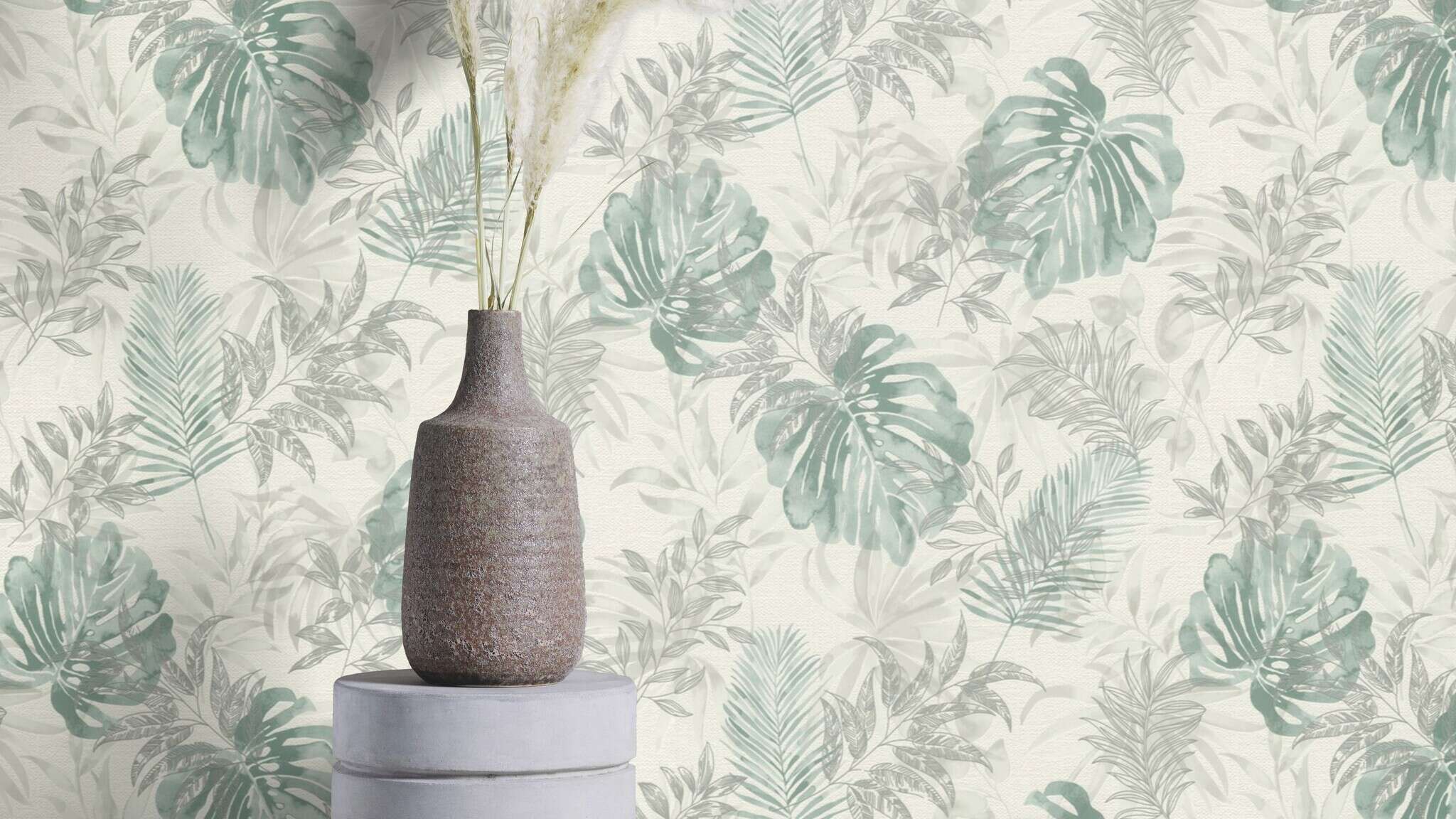 This stylish non-woven wallpaper brings a fresh and natural atmosphere to any room with its lush, tropical leaf pattern in soft green and grey tones. The detailed monstera and palm leaves are artistically arranged and appear particularly lively and elegant thanks to the watercolour-like colour gradients. The light, textured background colour emphasises the harmonious design and makes this wallpaper the perfect choice for modern living rooms, bedrooms or even offices with a natural flair.