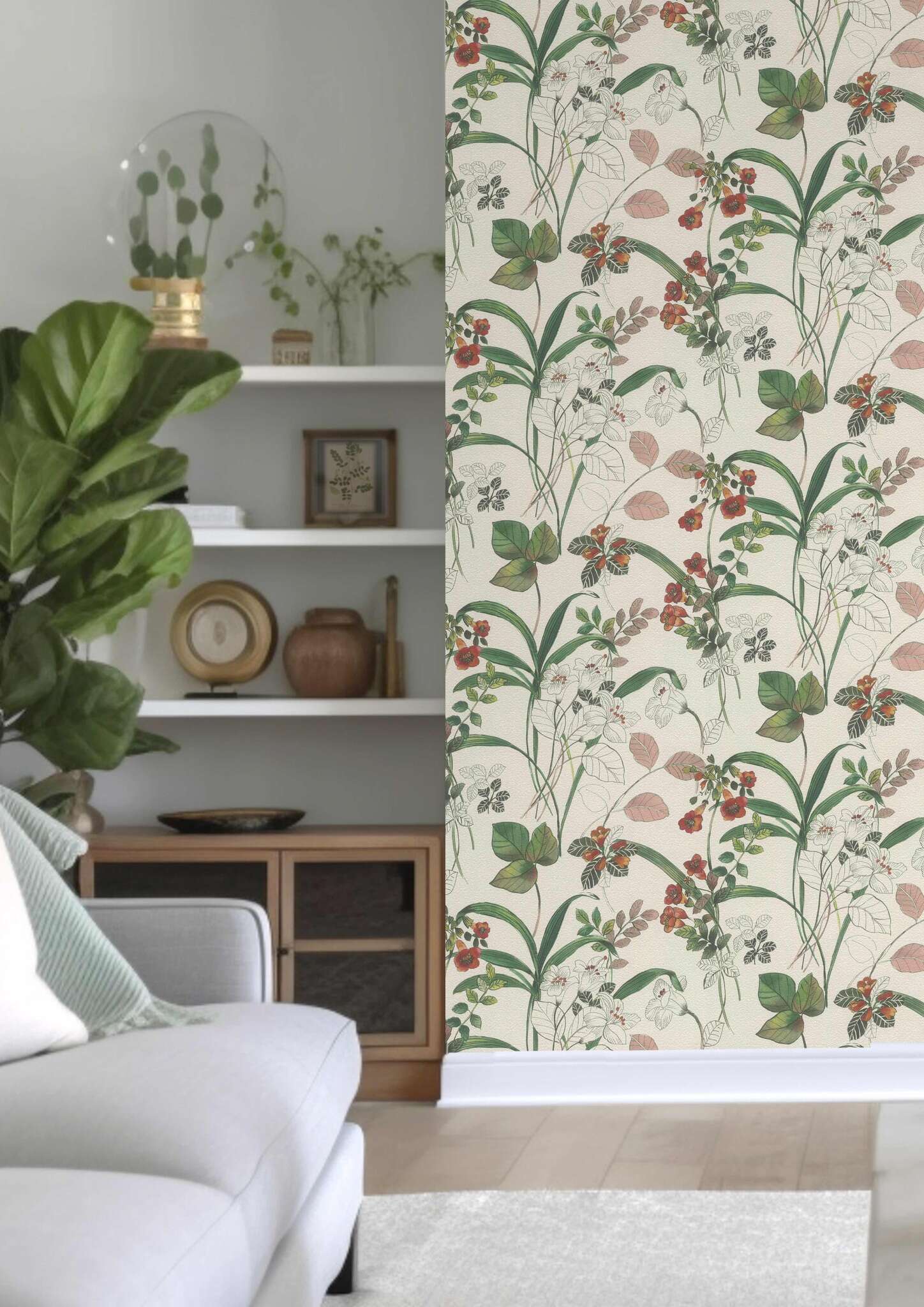 Dieses Design zeigt ein lebendiges, florales Muster mit kräftigen Farben. Die roten und orangefarbenen Blumen stechen hervor, während die grünen Blätter eine erfrischende Kontrastwirkung bieten. Die Umrisse der Pflanzen sind klar und detailliert, was dem Muster eine handgezeichnete, künstlerische Note verleiht. Die Kombination aus kräftigen Farben und feinen Linien schafft ein modernes, zugleich verspieltes Ambiente, ideal für Räume, die eine lebendige und fröhliche Atmosphäre vermitteln sollen.