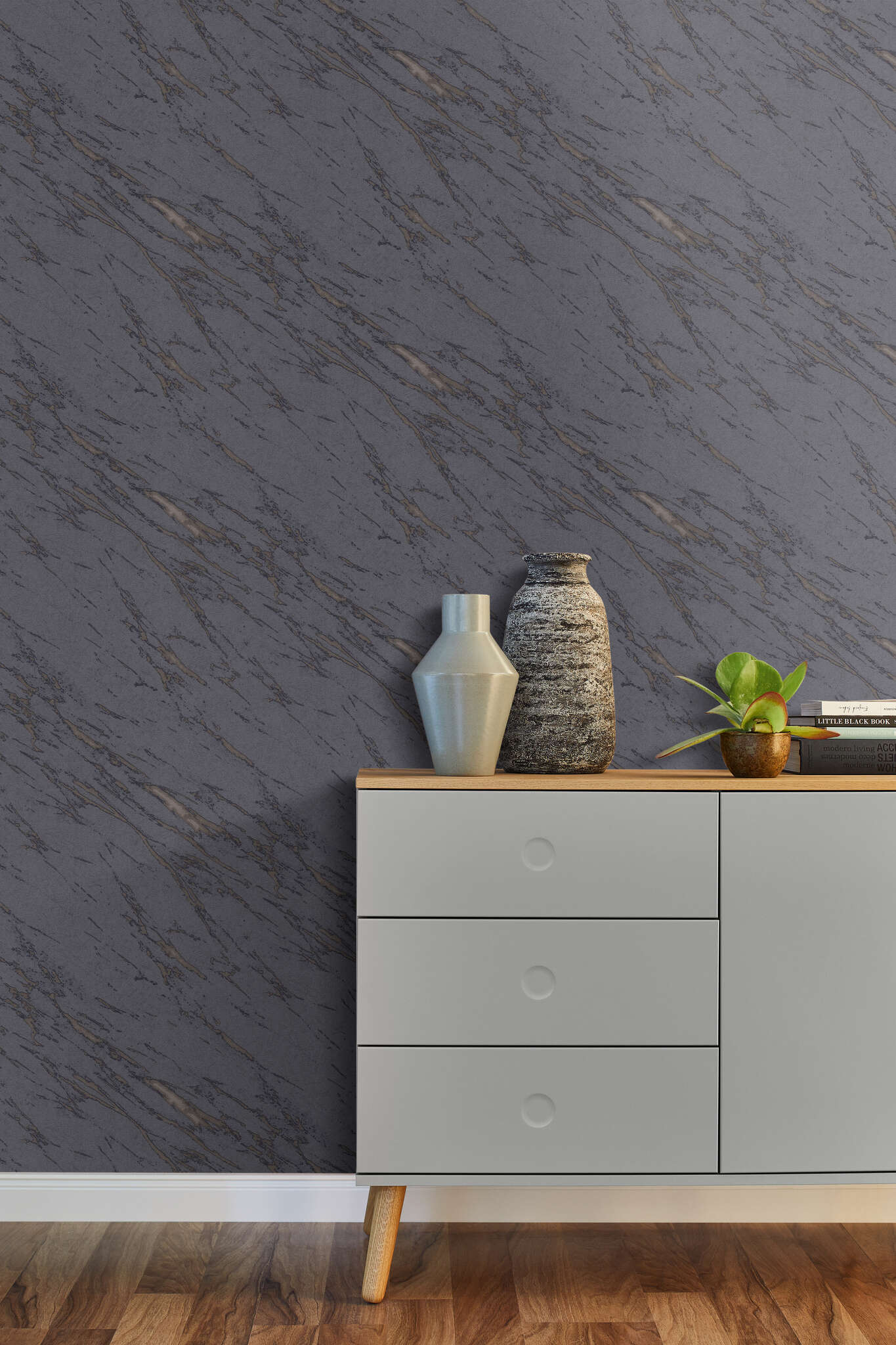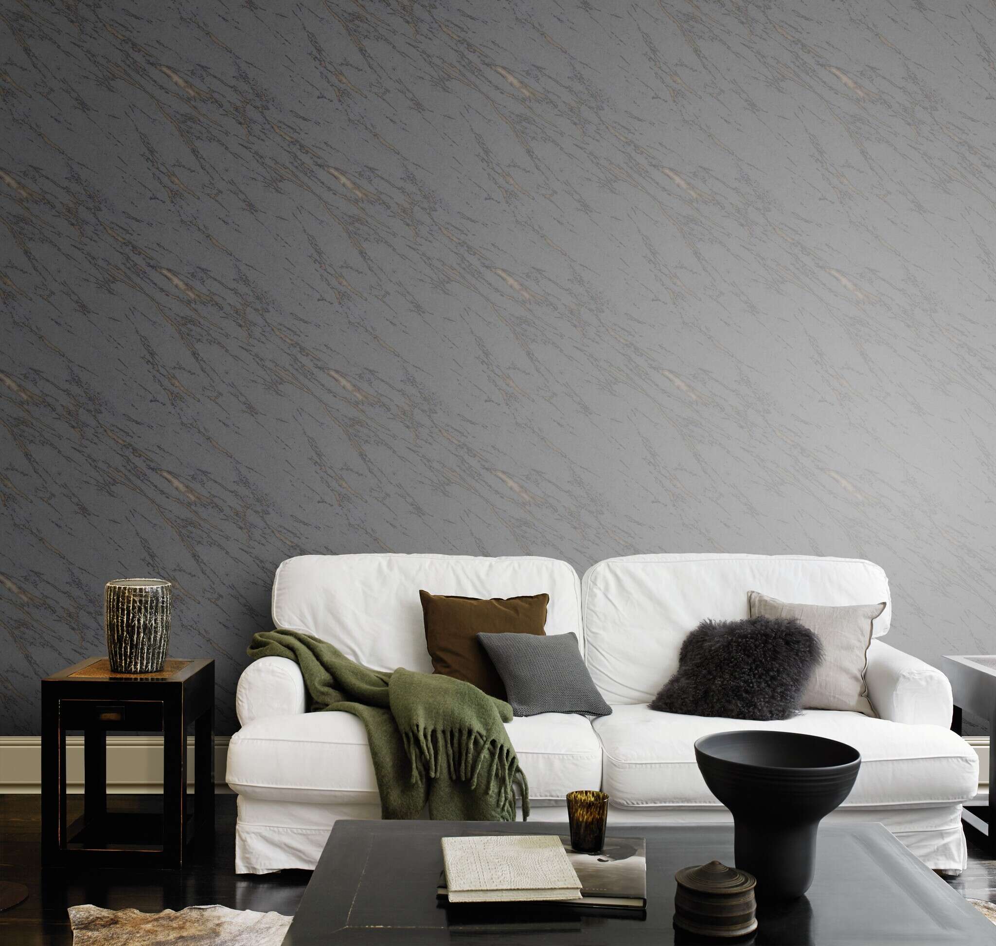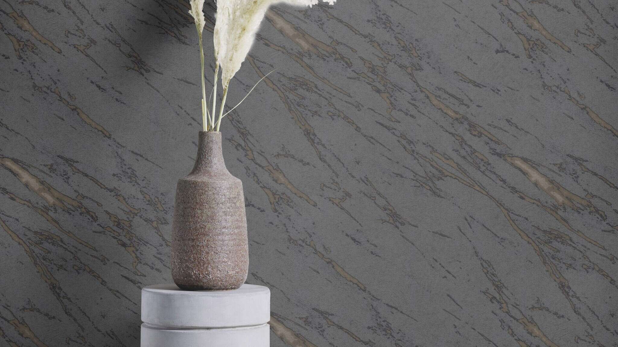 This wallpaper captivates with its striking marble look in deep dark grey with powerful black-brown veins. The dramatic interplay of colours gives the surface depth and character – ideal for modern rooms with urban flair or as a contrast in minimalist interiors. The diagonal structures create dynamism, while the dark colour scheme creates a luxurious, almost mystical effect.