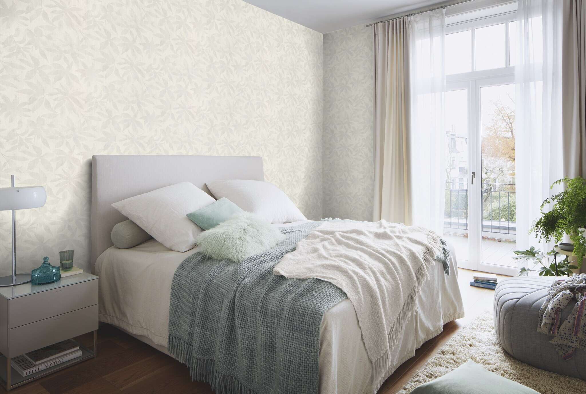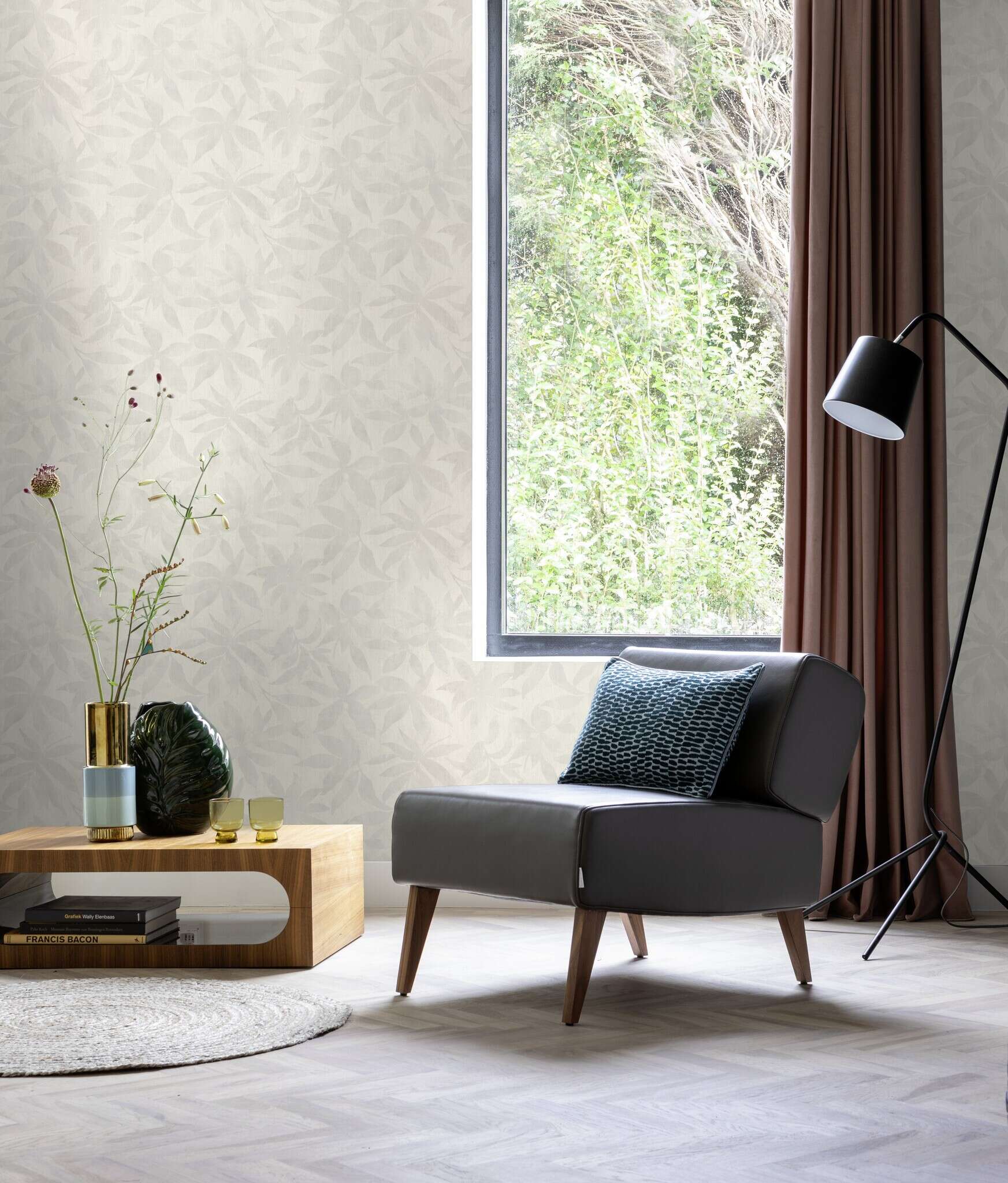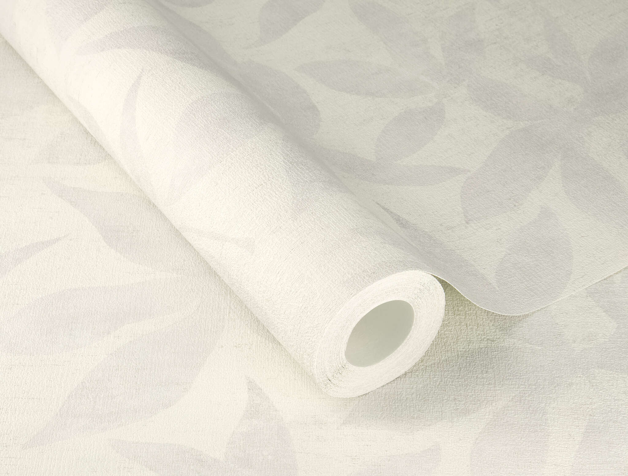 This wallpaper captivates with its delicate floral leaf pattern in light grey tones on a softly textured background. The almost monochrome colour scheme gives the design a modern, clean aesthetic without losing any of its warmth. The softly drawn contours create a subtle interplay of light and shadow, lending the room depth and tranquillity. This wallpaper is particularly effective in minimalist or Scandinavian-inspired interiors, creating a discreetly elegant atmosphere. Ideal for living and sleeping areas where a light, calm ambience is desired.