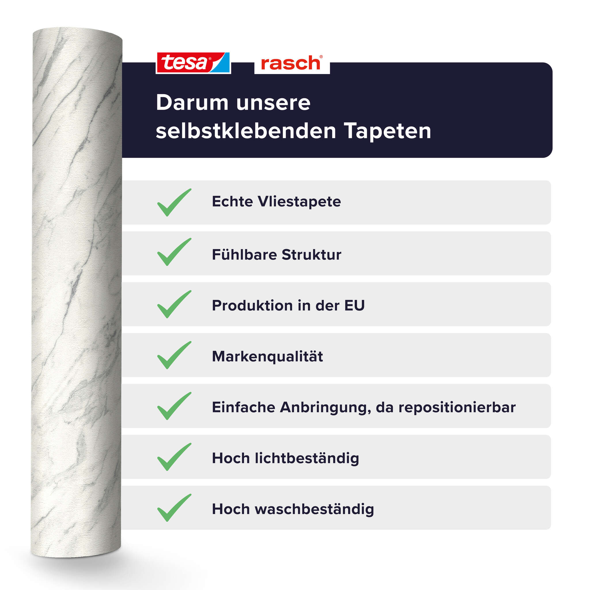 En collaboration avec tesa, nous avons établi de nouvelles normes et développé le premier papier peint structuré autocollant en non-tissé. Grâce à son matériau non tissé de haute qualité, notre papier peint autocollant n'a rien à envier aux papiers peints non tissés traditionnels : il est très résistant au lavage et à la lumière.