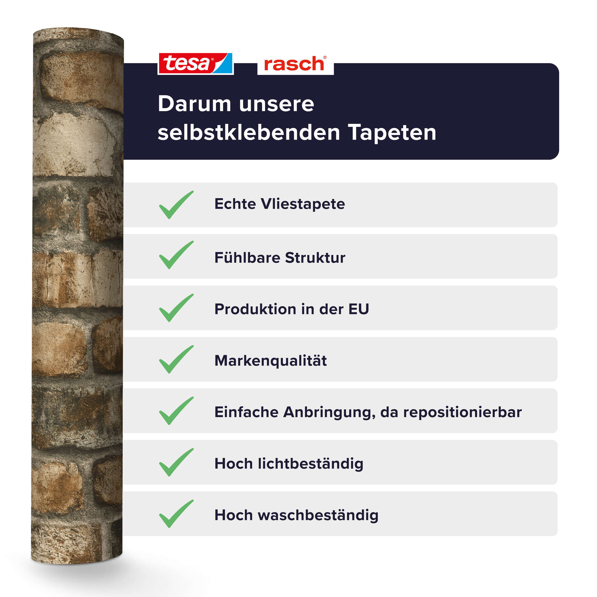 En collaboration avec tesa, nous avons établi de nouvelles normes et développé le premier papier peint structuré autocollant en non-tissé. Grâce à son matériau non tissé de haute qualité, notre papier peint autocollant n'a rien à envier aux papiers peints non tissés traditionnels : il est très résistant au lavage et à la lumière.