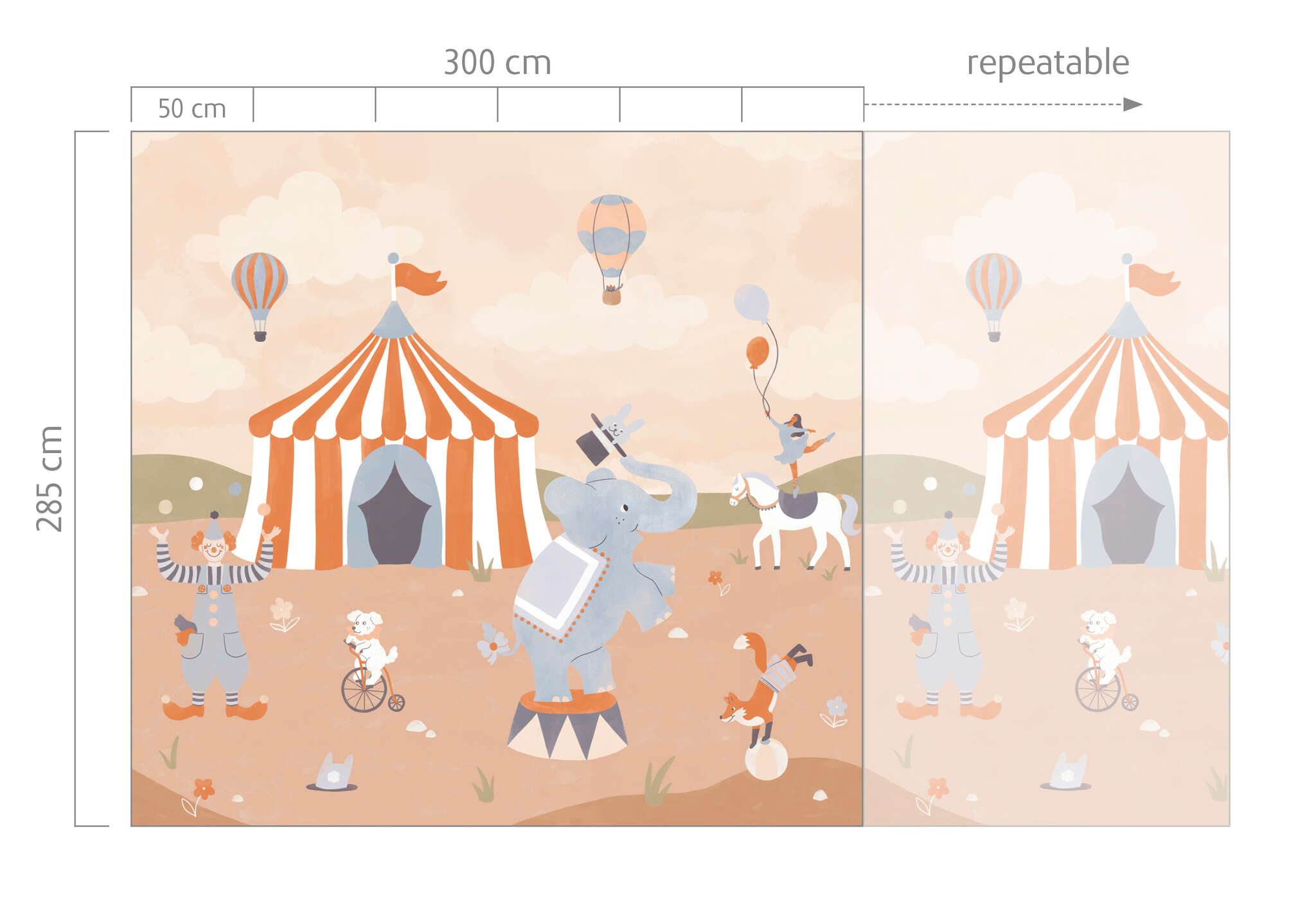 Diese Tapete zeigt eine fröhliche Zirkusszene in warmen, harmonischen Pastelltönen. Ein Elefant balanciert kunstvoll auf einem Podest, während ein Clown jongliert und ein Fuchs auf einem Ball Kunststücke vorführt. Im Hintergrund stehen ein großes rot-weißes Zirkuszelt und schwebende Heißluftballons, die der Szene Leichtigkeit verleihen. Die liebevollen Illustrationen und sanften Farben machen das Design ideal für Kinderzimmer – verspielt, freundlich und voller Fantasie.