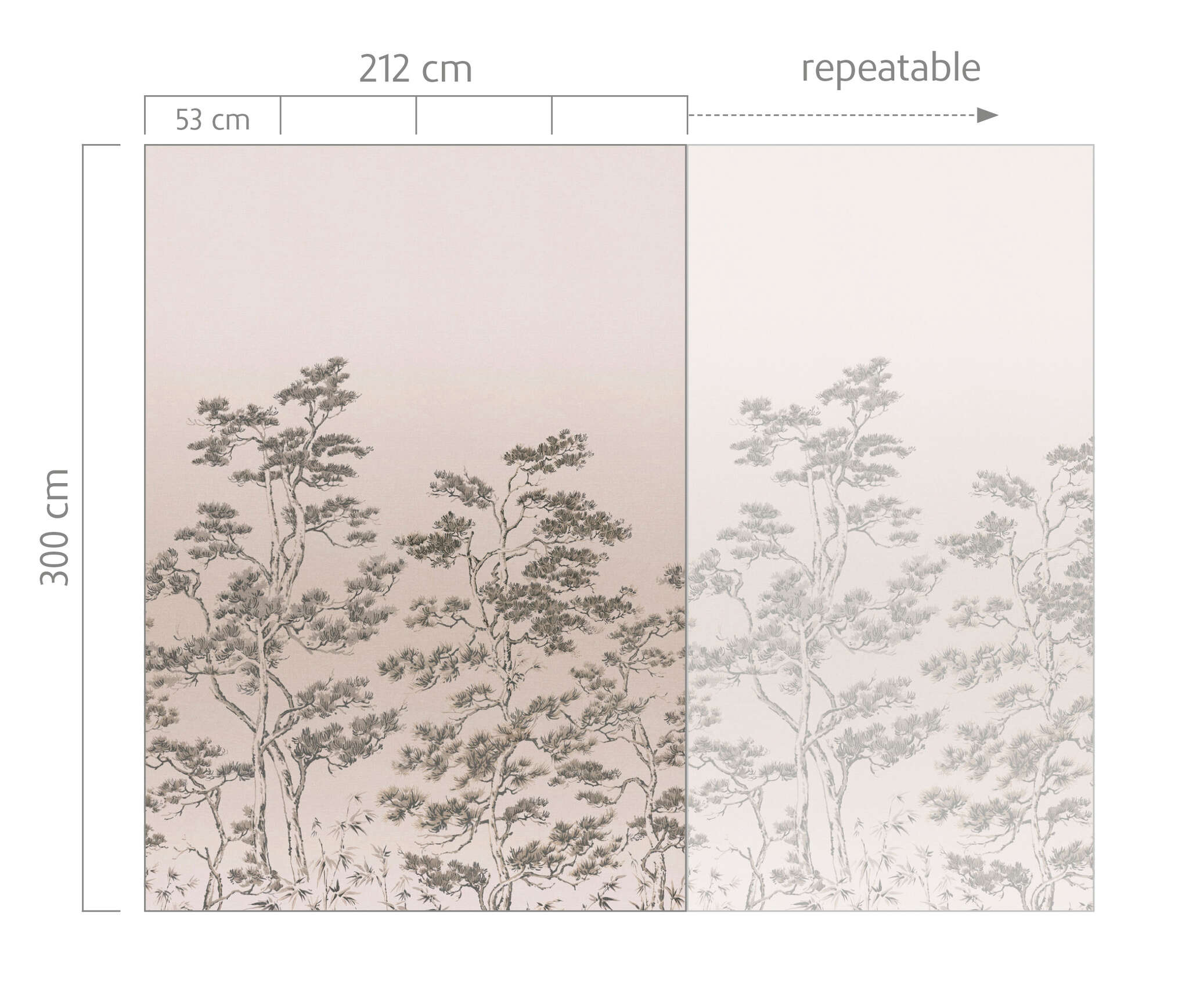 Les arbres et les herbes denses s'enroulent dans un brun délicat sur l'impression numérique beige. Cette magnifique forêt crée immédiatement un sentiment de confort douillet et donne l'impression d'un tableau peint à la main sur le mur.