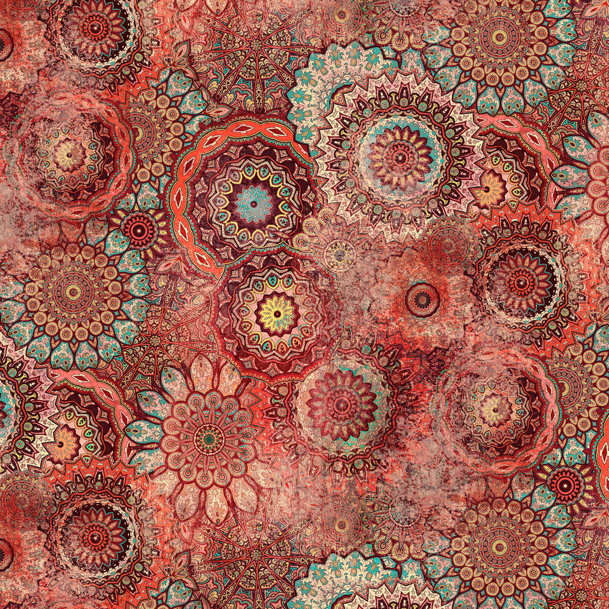 Oho Boho ! L’abondance de couronnes de fleurs de style hippie apporte beaucoup de joie et de vie sur le mur. Les couleurs sont lumineuses avec le rouge corail, le bleu clair et le bordeaux. Les légers effets délavés apportent de la nuance au décor – et tout reste insouciant et léger.