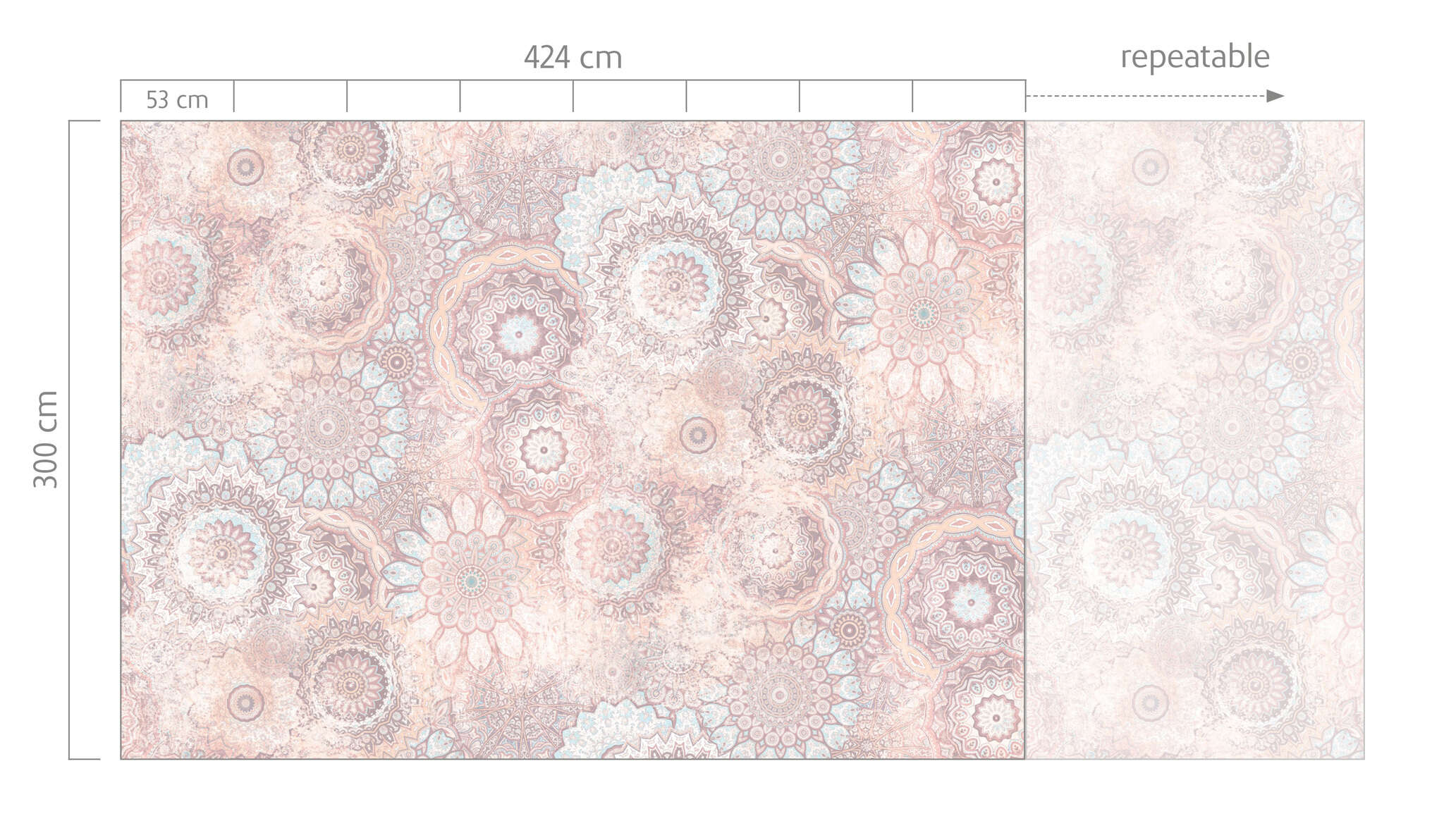 Oho Boho ! L’abondance de couronnes de fleurs de style hippie apporte beaucoup de joie et de vie sur le mur. Les couleurs rayonnent avec le rose pastel, le bleu clair et le crème. Les légers effets délavés apportent de la nuance au décor – et tout reste insouciant et léger.