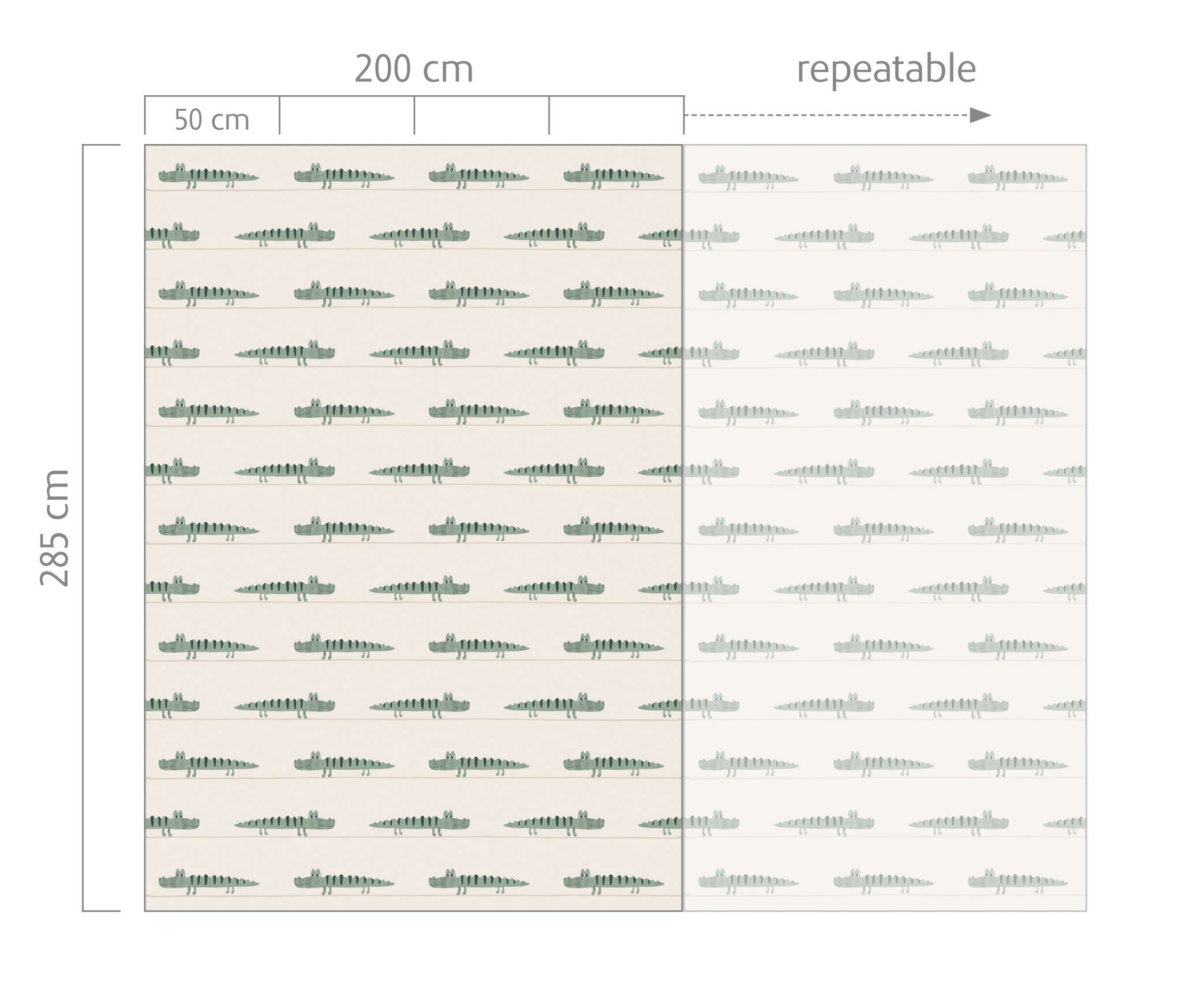 Discover Mr Croco, a delightful wallpaper featuring cheerful crocodiles that bring fun and excitement to any children's room. You might recognize Mr Croco from our popular wallpaper Zoo. After numerous requests for a standalone wallpaper starring this charming character, Mr Croco now gets the spotlight he truly deserves. Crafted with high-quality materials, Mr Croco is designed for durability and ease of maintenance, ensuring it can withstand the rigors of a bustling children's room. The fun and friendly design is suitable for children of all ages, making it a beloved feature as they grow and explore. Available colours: - Beige - Green
