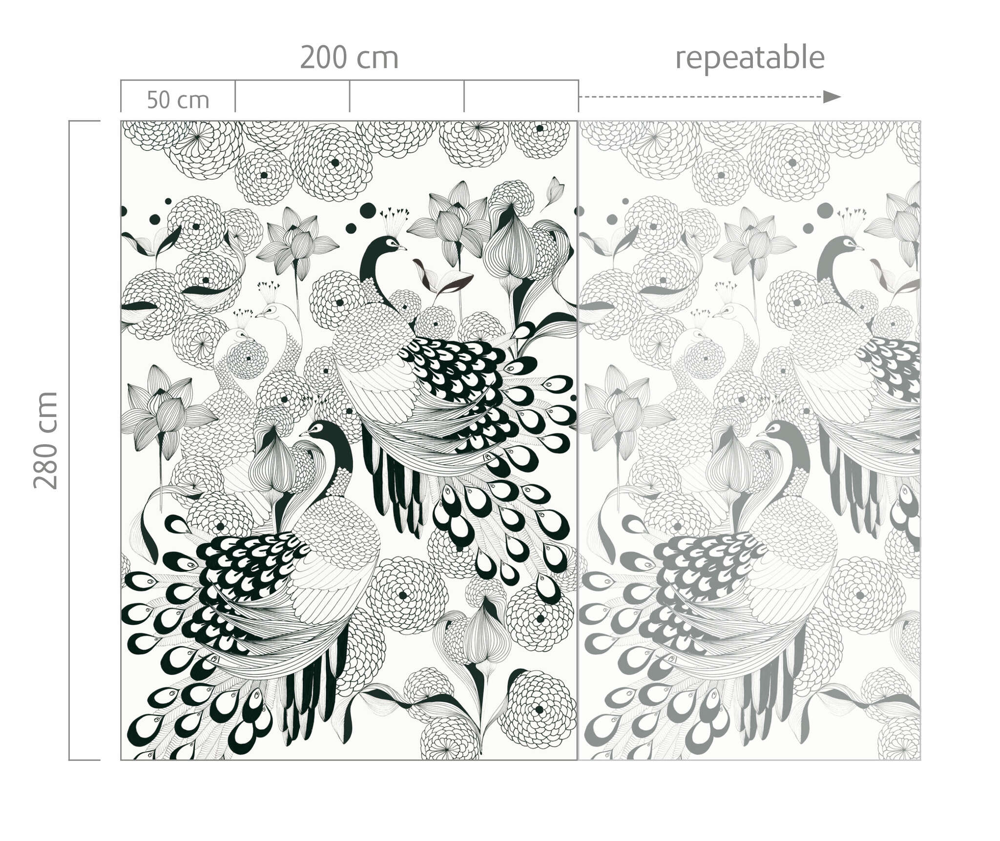 This wallcovering design – proud as a peacock – will definitely draw some admiring glances. Featuring exquisitely finely drawn feathers, the result is a composition of charming animals, delicate blooms and exotic flowers. In black and white, it looks utterly modern and makes a real impression on the wall.