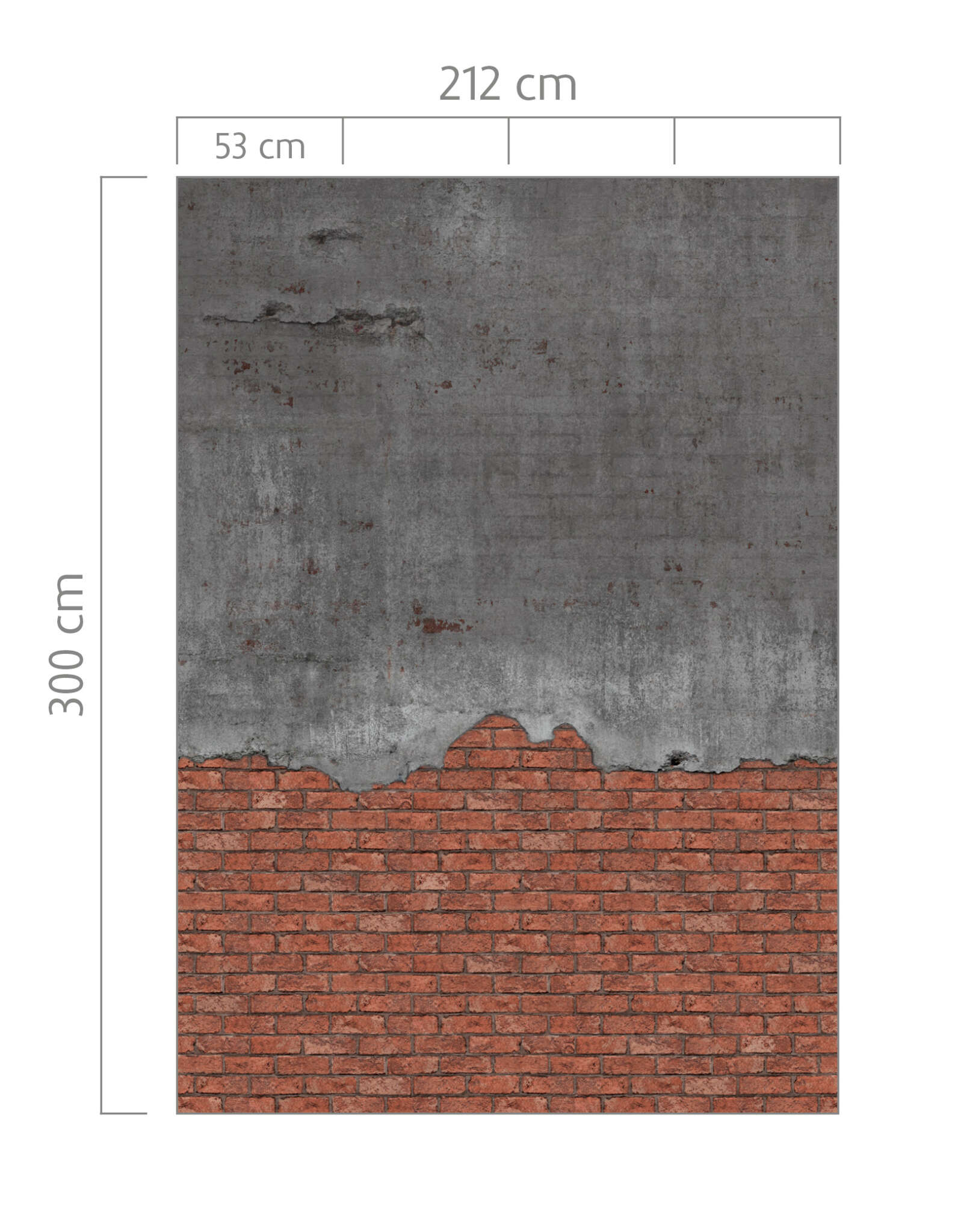 Cosy construction site charm doesn't have to be a contradiction. This mural (212 x 300 cm) proves it. The brick wall in red and the grey concrete show that not everything always has to be perfect and that even imperfections can be fantastic.