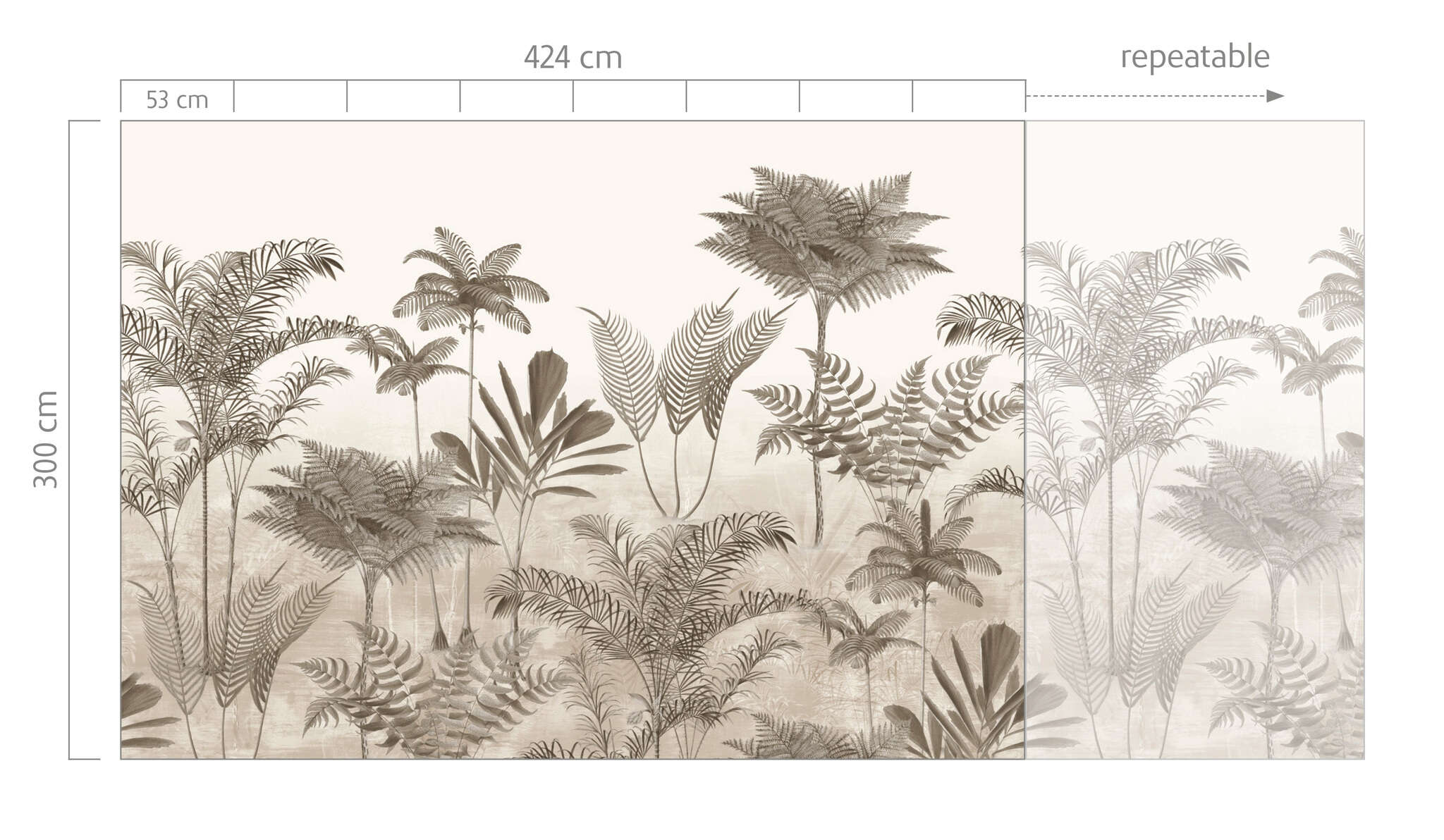 You don't even have to travel far for a tropical holiday feeling, because fortunately you can now enjoy the palm forest right into your home with this 424 cm x 300 cm mural. A wide variety of tropical plants thrive on the wall without watering in elegant sepia colours. Simply ensconce yourself in the middle of it all and enjoy the view.