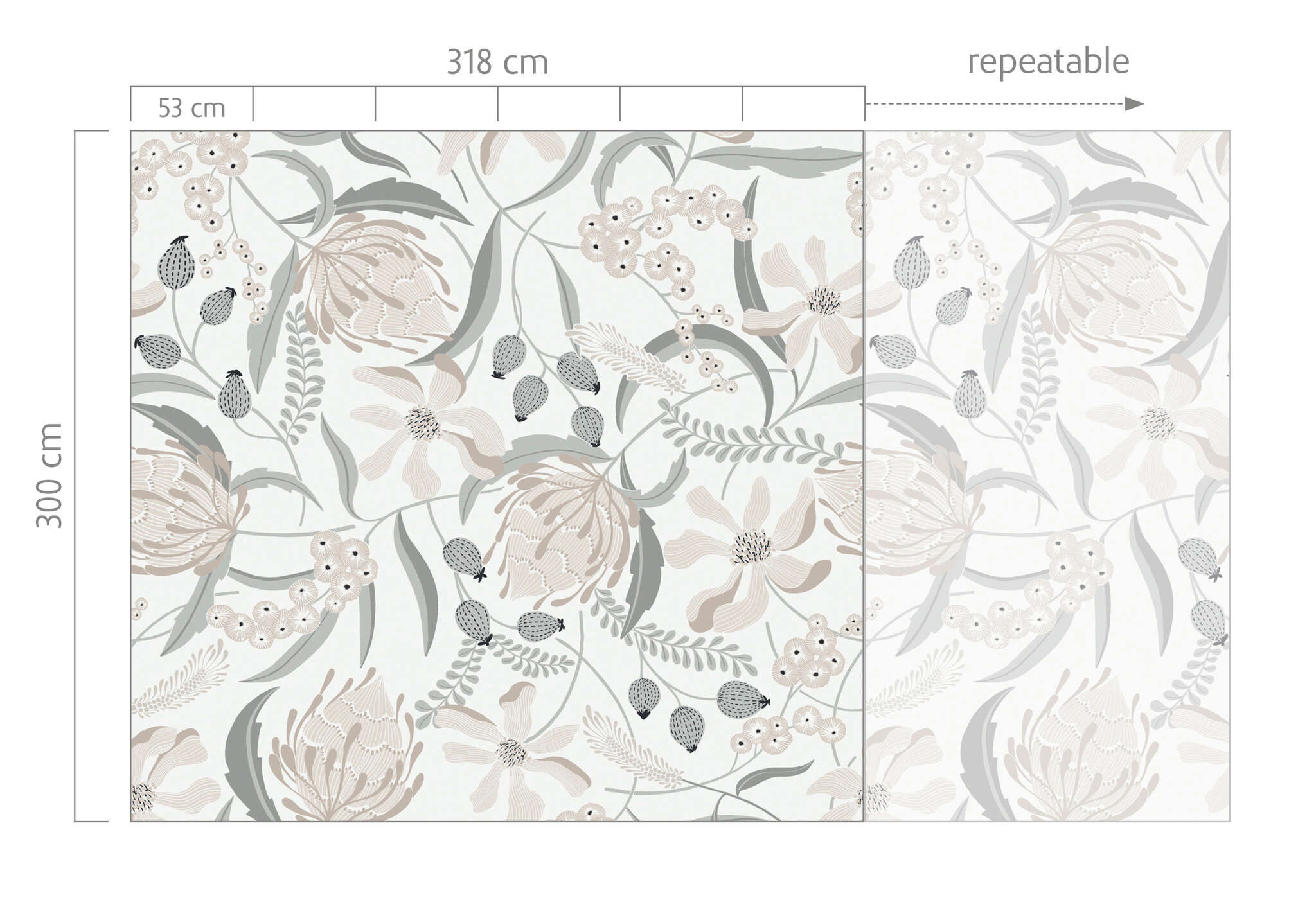 An exotischen Blüten können Sie sich nicht sattsehen? Dann tapezieren Sie sich doch unser Wandbild PLAYFUL an die Wand! Diese elegante Tapete besticht durch ein florales Muster auf einem hellen Hintergrund. Feine Protea-Blüten, Blätter und Beeren in sanften Beige- und Grautönen verleihen ihr eine edle, natürliche Ästhetik. Perfekt für stilvolle Akzentwände mit modernem Charme. Das Wandbild besteht aus 6 Bahnen, mit einer Höhe von 3,00 Metern und einer Breite von 3,18 Metern.