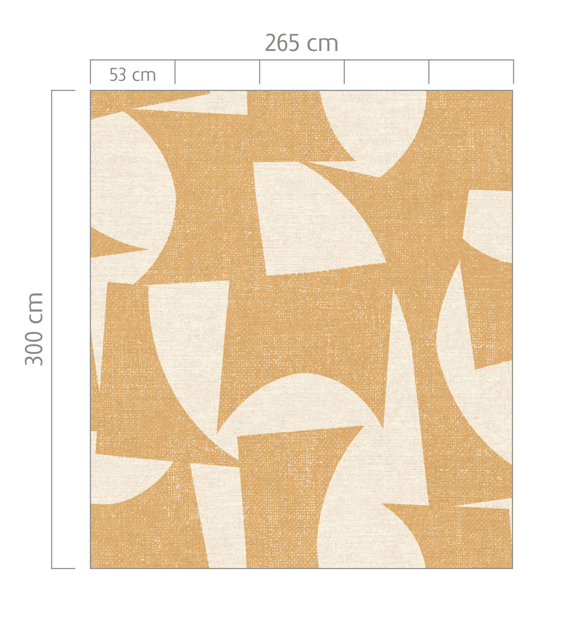 In good shape: The design of the 3.00 m x 2.65 m Abstract digital wallpaper has a clear edge and gives the room a very personal touch with its unusual design language. The warm curry yellow and creamy white colours create a cosy feel and a natural interior vibe. Best used as an accent wall with colour-coordinated cushions or accessories.