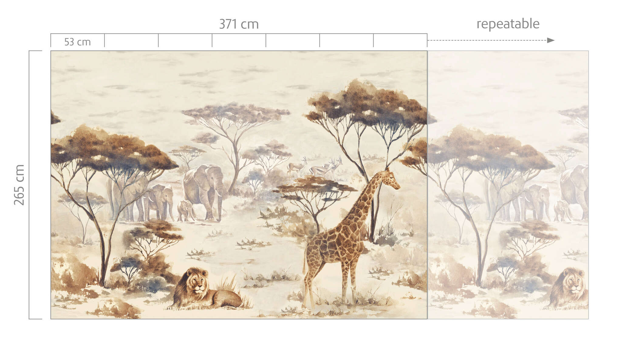 Join us on a safari as giraffes, lions and a herd of elephants await our visit to the African Savannah. The fabulous image in beige and brown shades shows a breath-taking scene of the stunning flora and fauna of Africa. This mural measuring 371cm x 265cm (width x height) brings the adventure straight into your home!