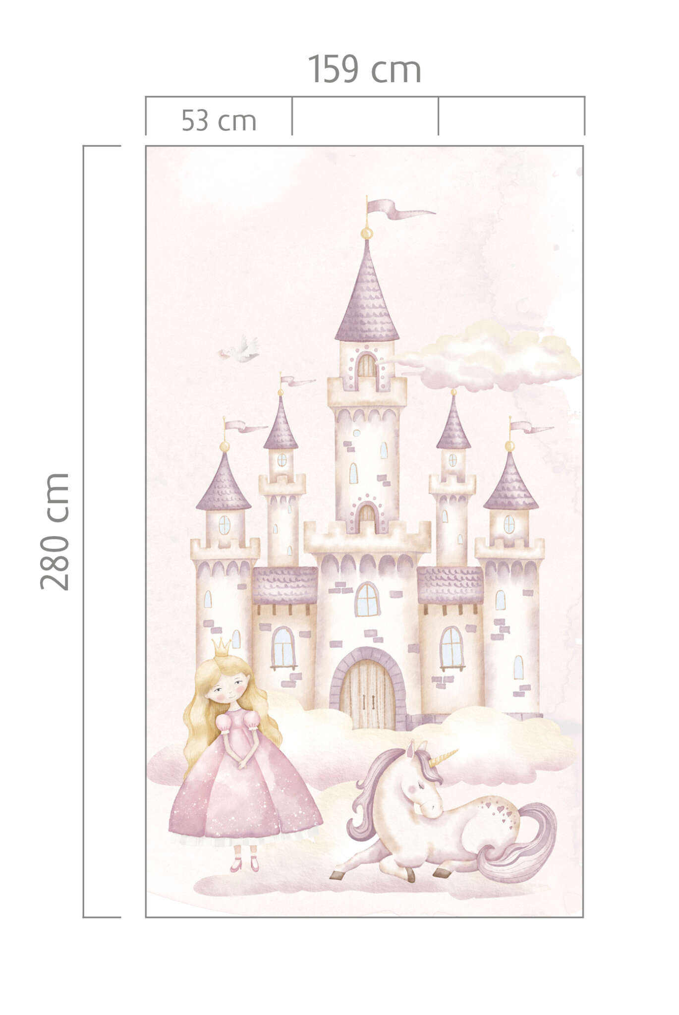Diese märchenhafte Wandbild entführt Kinder in eine magische Märchenwelt voller Fantasie und Träume. Sanfte Pastelltöne in Rosa, Flieder und Creme schaffen eine verträumte Atmosphäre, die von einer Prinzessin, einem Schloss und einem Einhorn erzählt. Ideal für Kinderzimmer, in denen Geschichten zum Leben erwachen und kleine Träumerinnen sich wie im Märchen fühlen können.